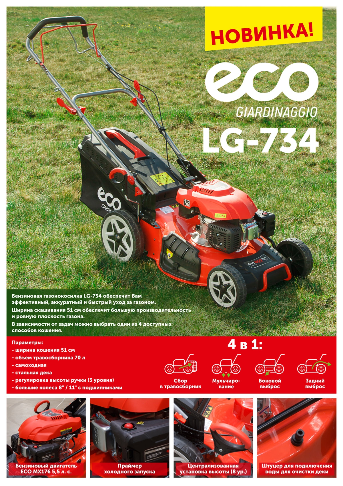 Газонокосилка бензиновая ECO LG-734 самоходная (5.5 л.с., шир. 51 см, самоходная, мульчир., стальн. корпус, травосборник 70 л)