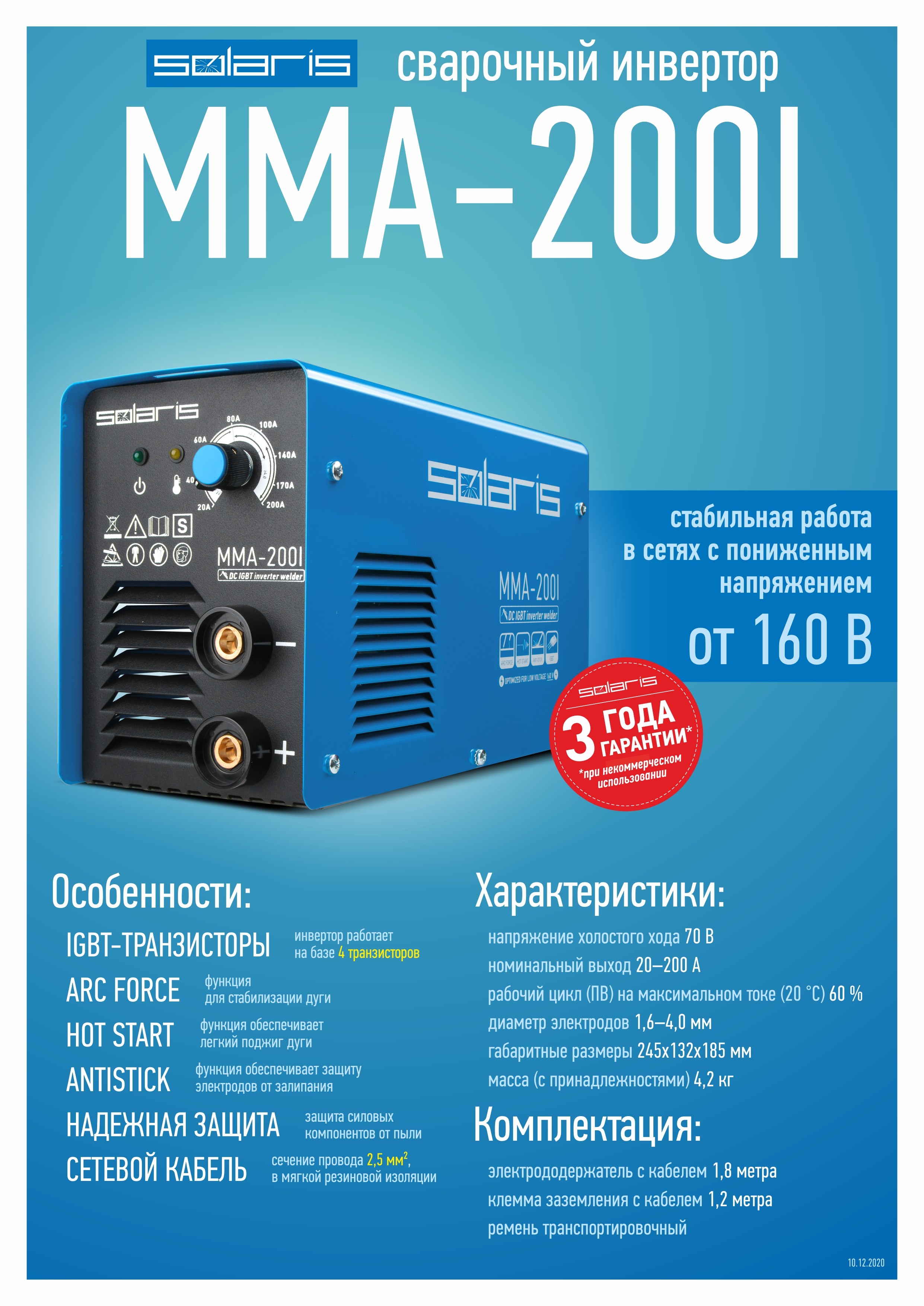 Инвертор сварочный SOLARIS MMA-200I (230В; 20-200 А; 70В; электроды диам. 1.6-4.0 мм; вес 3.4 кг)