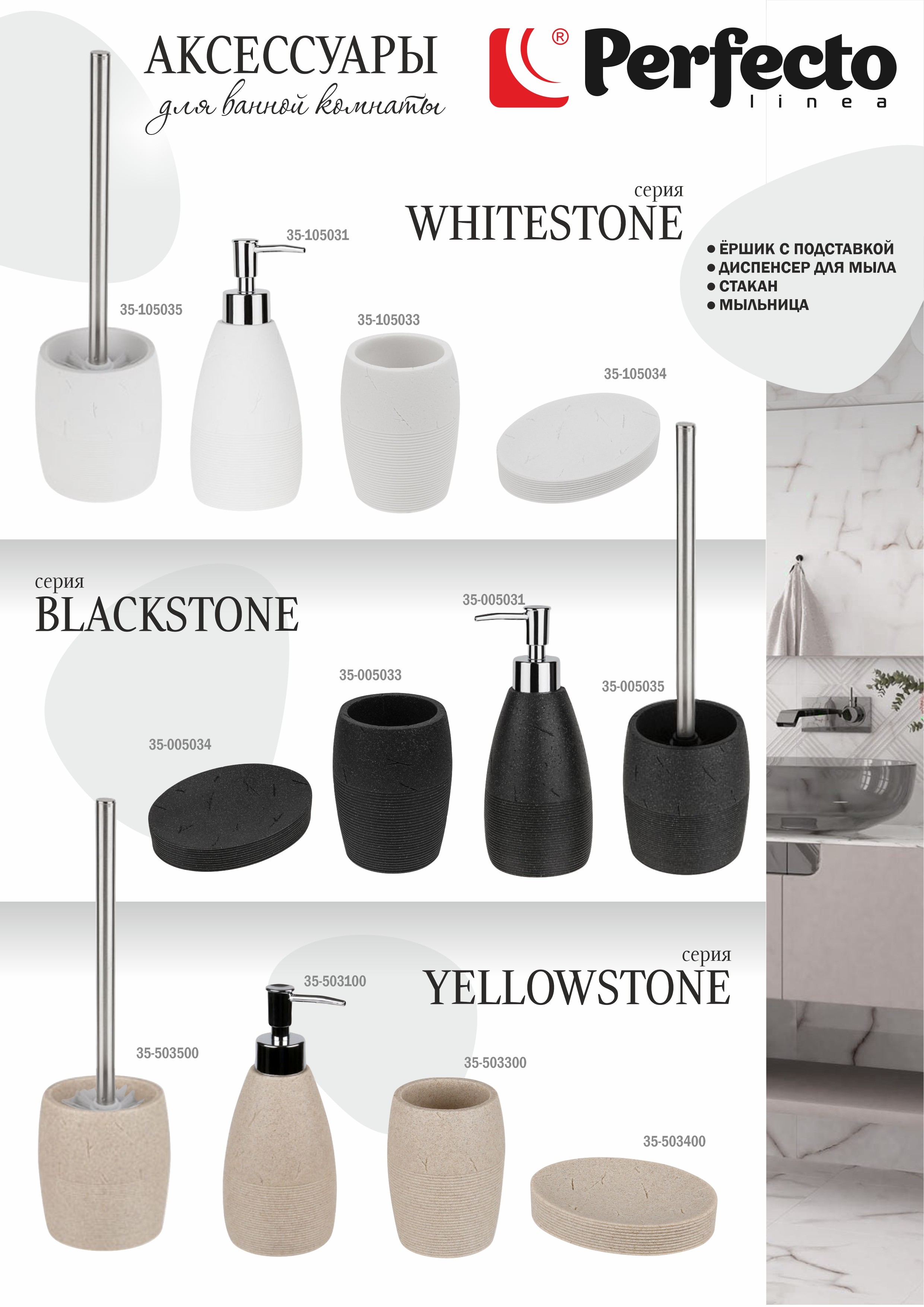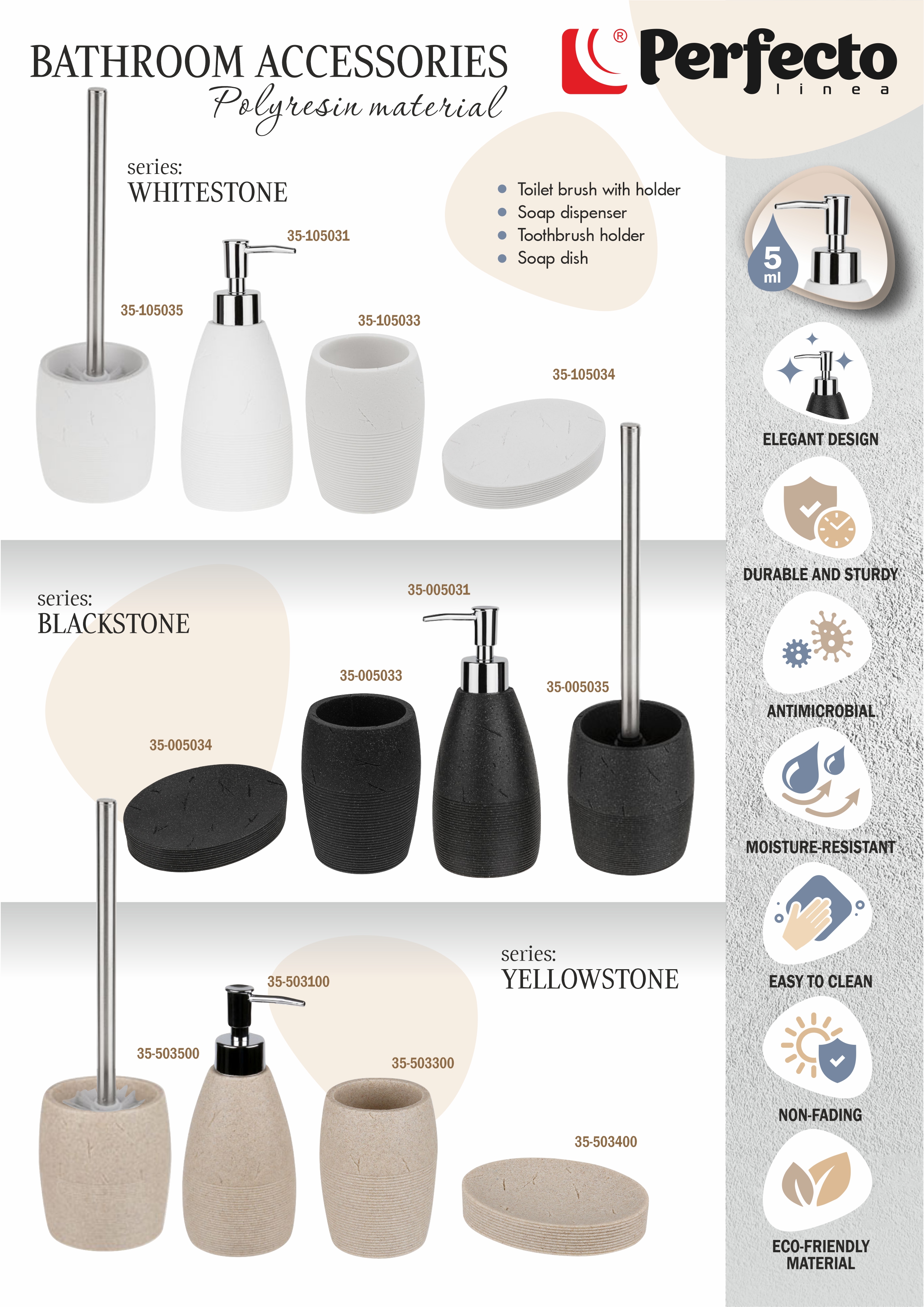 Необычный дизайн, созданный с помощью композитного материала: полирезина под натуральный камень. Благодаря такой структуре изделие имеет низкую теплопроводность, приятное на ощупь, а также устойчиво к влаге и повышенным температурам. Преимущества товаров для ванной комнаты из полирезина: - Водоустойчивость. Идеально подходят для любой среды с повышенной влажностью. - Антибактериальность. Непористая структура обеспечивает устойчивость к развитию плесени и микробов. - Прочность. Не деформируется, не бьется, не трескается, не облазит и не царапается. - Защита от УФ-излучения предотвращает пожелтение и выцветание. - Экологичность: нет запаха и каких-либо выделений токсичных или раздражающих веществ. - Экономичность: любое изделие легко очищается водой с добавлением мыла.