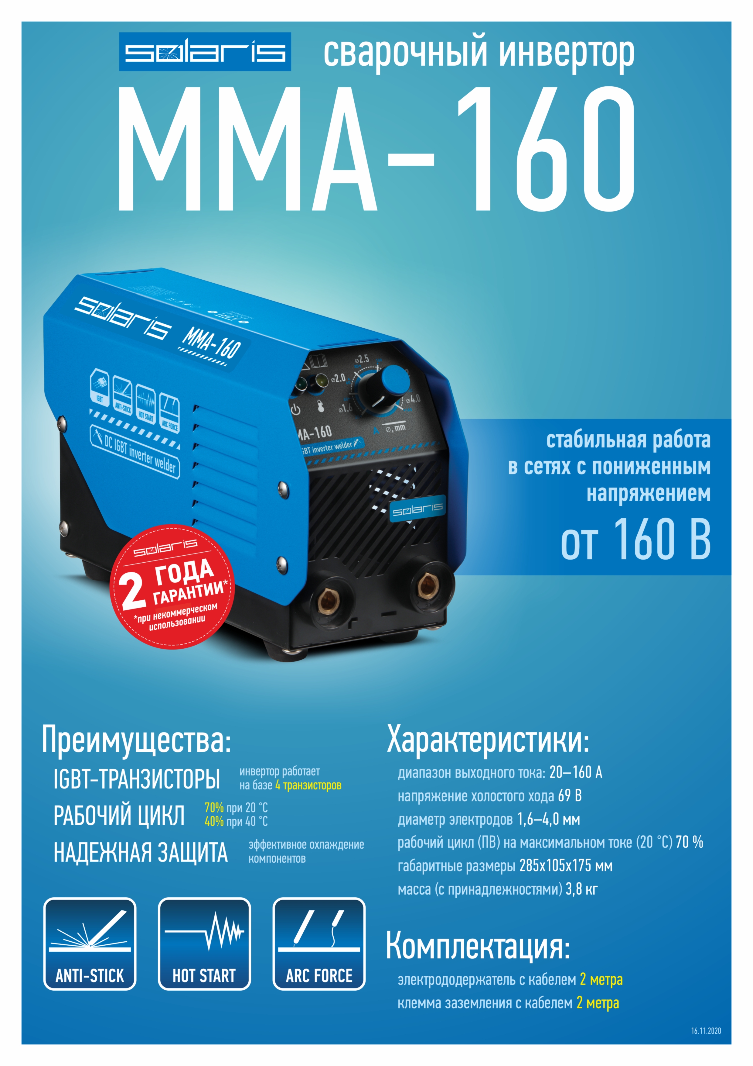 Инвертор сварочный SOLARIS MMA-160 (230В; 20-160 А; 69В; электроды диам. 1.6-4.0 мм; вес 3.0 кг)