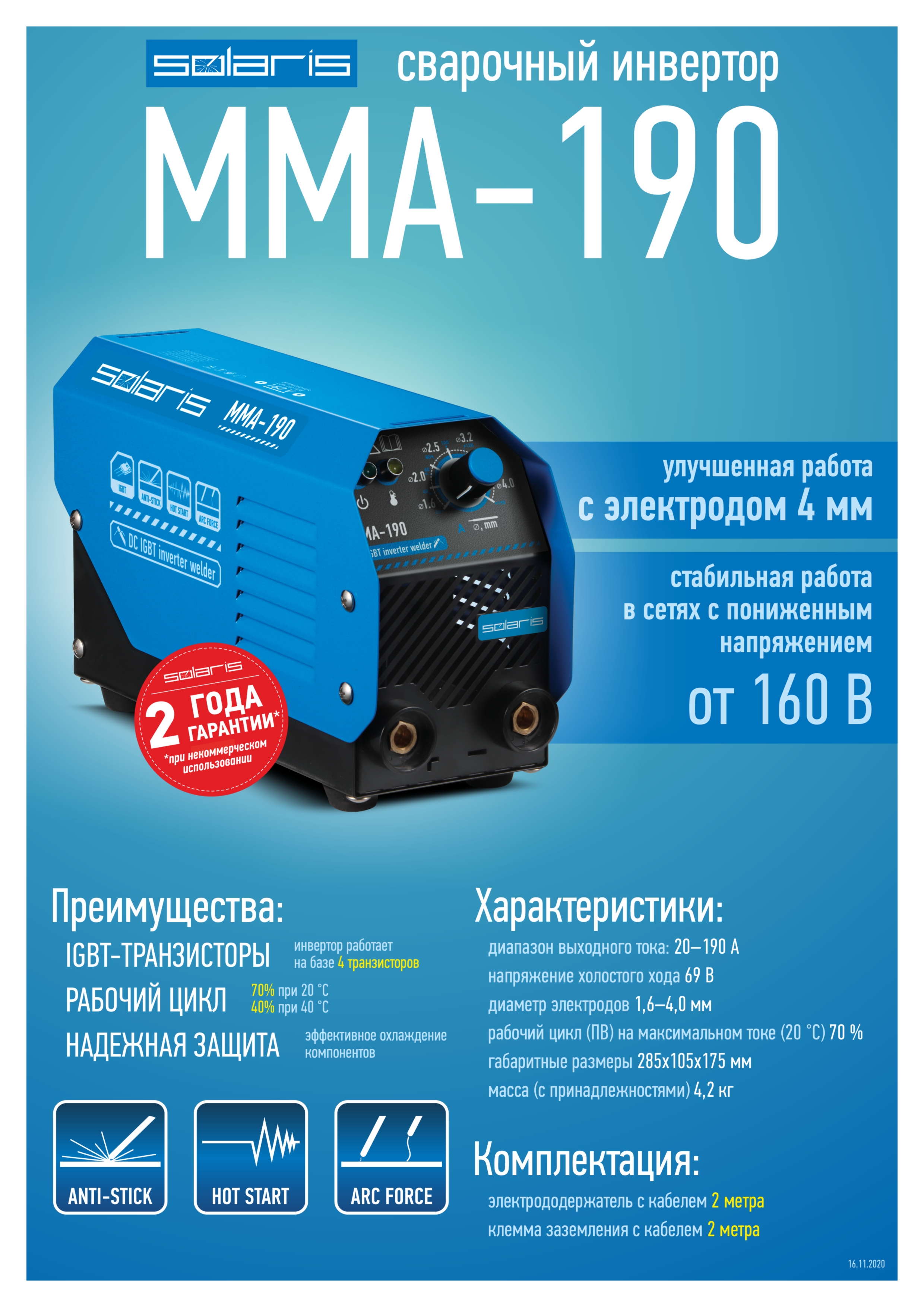 Инвертор сварочный SOLARIS MMA-190 (230В; 20-190 А; 69В; электроды диам. 1.6-4.0 мм; вес 3.4 кг)