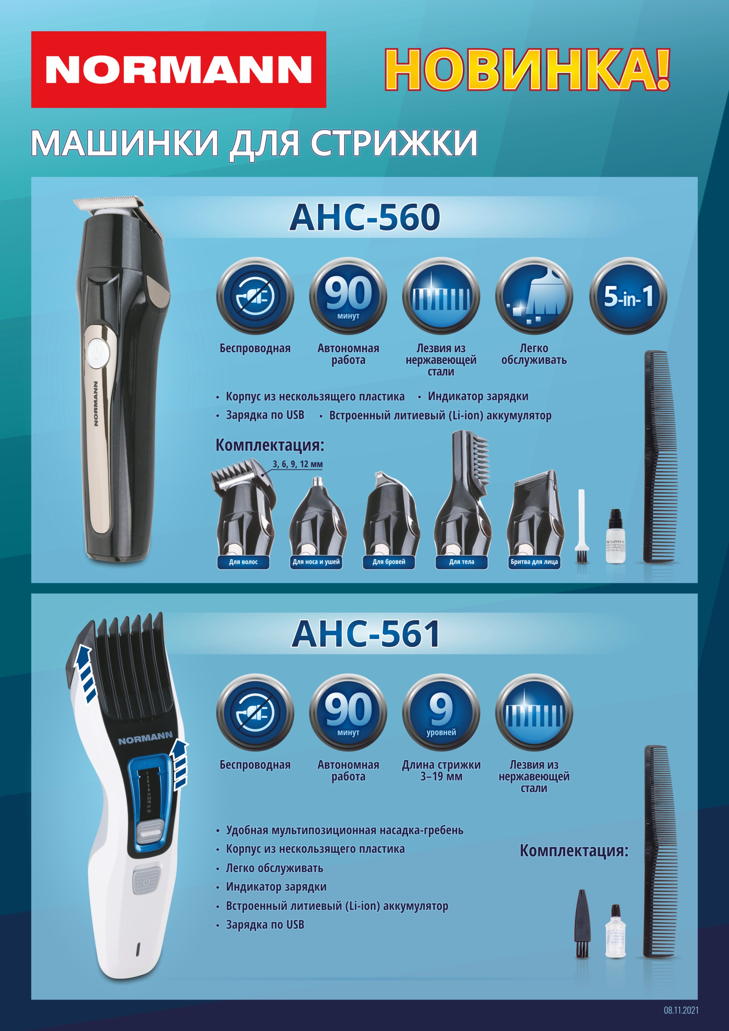 Машинка для стрижки волос NORMANN AHС-561 (Li-ion аккум. 90 мин; насадка 1-19 мм; USB-шнур)