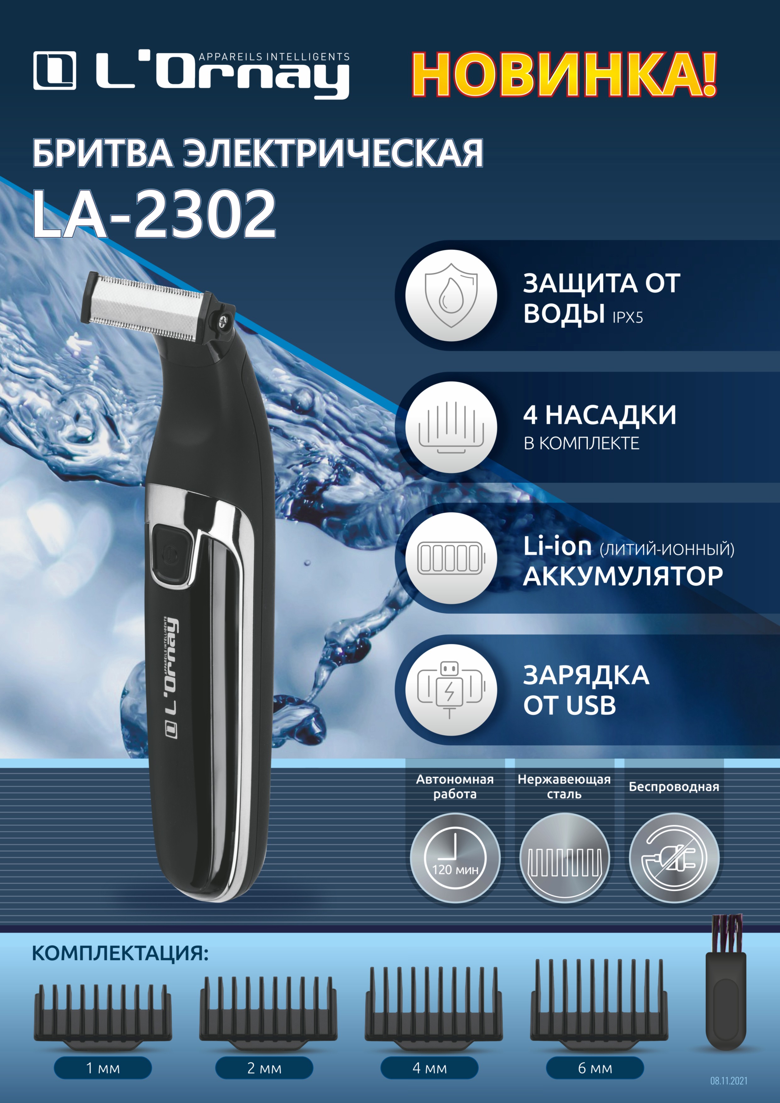 Бритва электрическая L'ORNAY LA-2302 (Li-ion аккум; двухсторонний триммер; IPX5; насадки 1, 2, 4, 6 мм; USB-шнур)