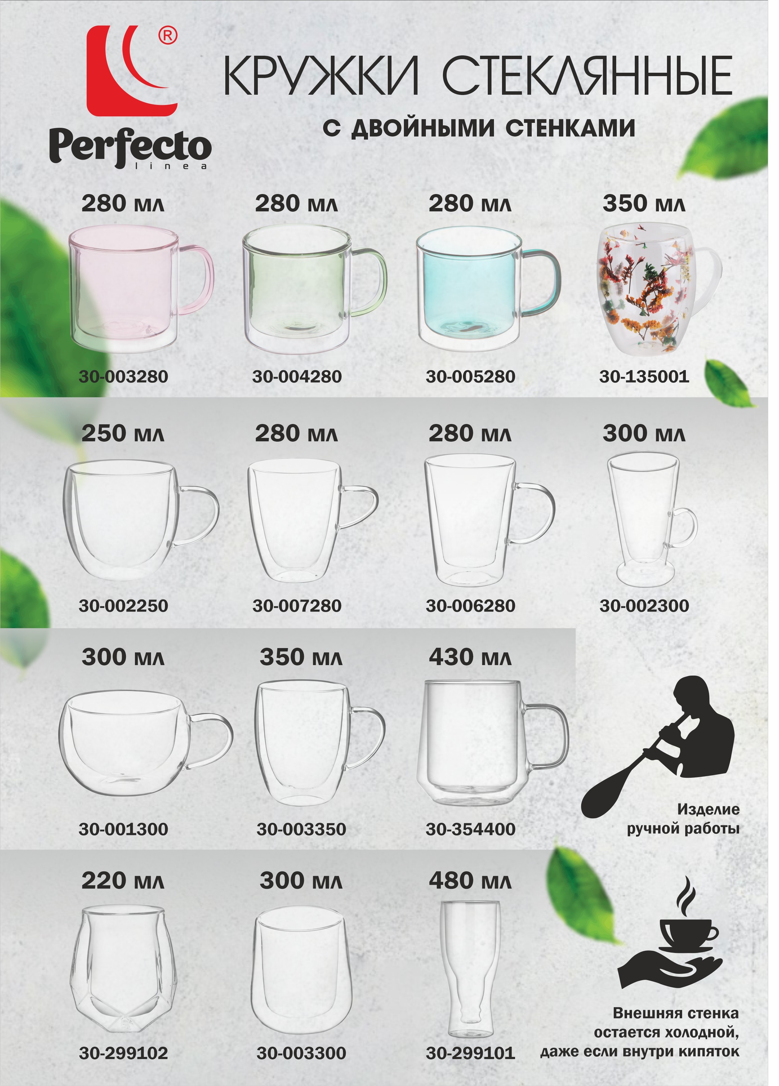 Бокал стеклянный с двойными стенками дольше сохраняет температуру напитка. Горячее будет долго не остывать, а холодные напитки, напротив, не будут становится теплыми.Стакан не будет обжигать руки и деформировать поверхности. Такие способности придают этому стакану двойные стенки и прослойка воздуха, находящаяся между ними. Боросиликатное стекло остается блестящим всегда, ведь оно не подвержено царапинам.