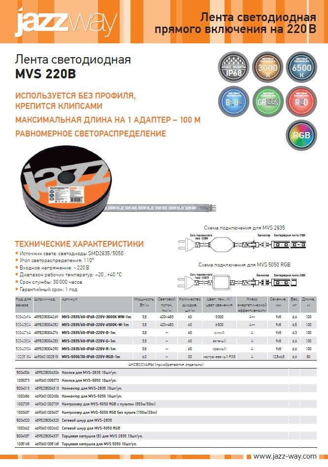 Светодиодная лента MVS на 220В современная замена дюралайта. В отличие от дюралайта имеет больший световой поток и направленное свечение. Благодаря высокой степени защиты IP68, ленту можно использовать на улице для архитектурной подсветки. Аксессуары к ленте можно приобрести отдельно.