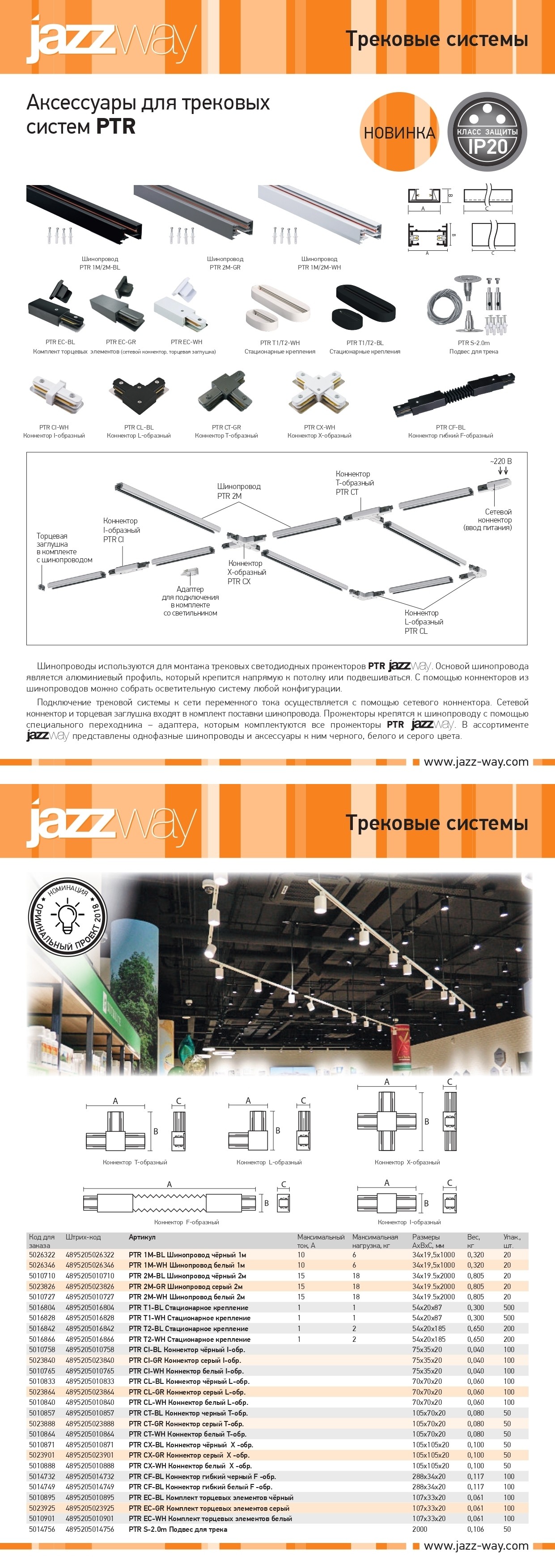 Подключение трековой системы к сети переменного тока осуществляется с помощью сетевого коннектора. Сетевой коннектор и торцевая заглушка входят в комплект поставки шинопровода. Прожекторы крепятся к шинопроводу с помощью специального переходника адаптера, которым комплектуются все прожекторы PTR . В ассортименте представлены однофазные шинопроводы и аксессуары к ним черного и белого цвета.