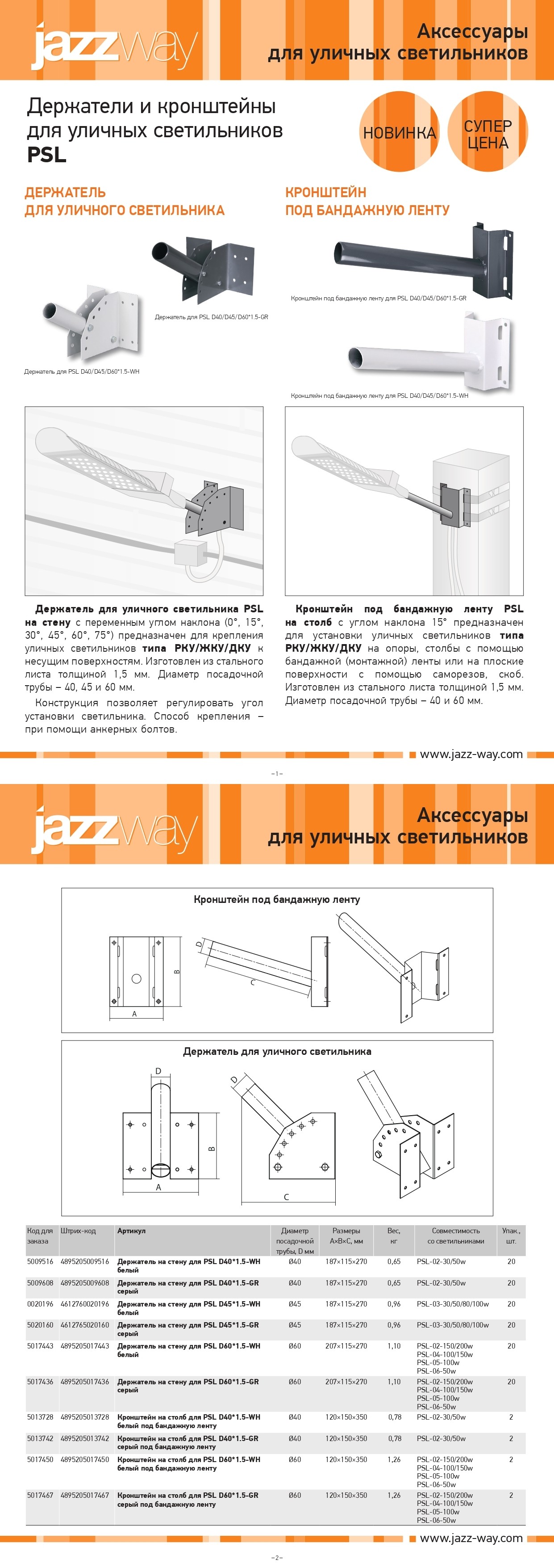 Цвет корпуса: серый Размеры, мм: 187х115х270 Посадочный размер D, мм: ф40 Вес: 650 гр Упаковка, шт: 120 Держатель для уличного светильника PSL (РКУ) на стену с переменным углом наклона (0, 15, 30, 45, 60, 75) предназначен для крепления уличных светильников типа РКУ ЖКУ к несущим поверхностям. Изготовлен из стального листа толщиной 1,5 мм. Диаметр посадочной трубы 40мм. Конструкция позволяет регулировать угол установки светильника, что обуславливает удобство в эксплуатации. Способ крепления при помощи анкерных болтов. Совместимость со светильниками: PSL 02 3050w, PSL 06 50w