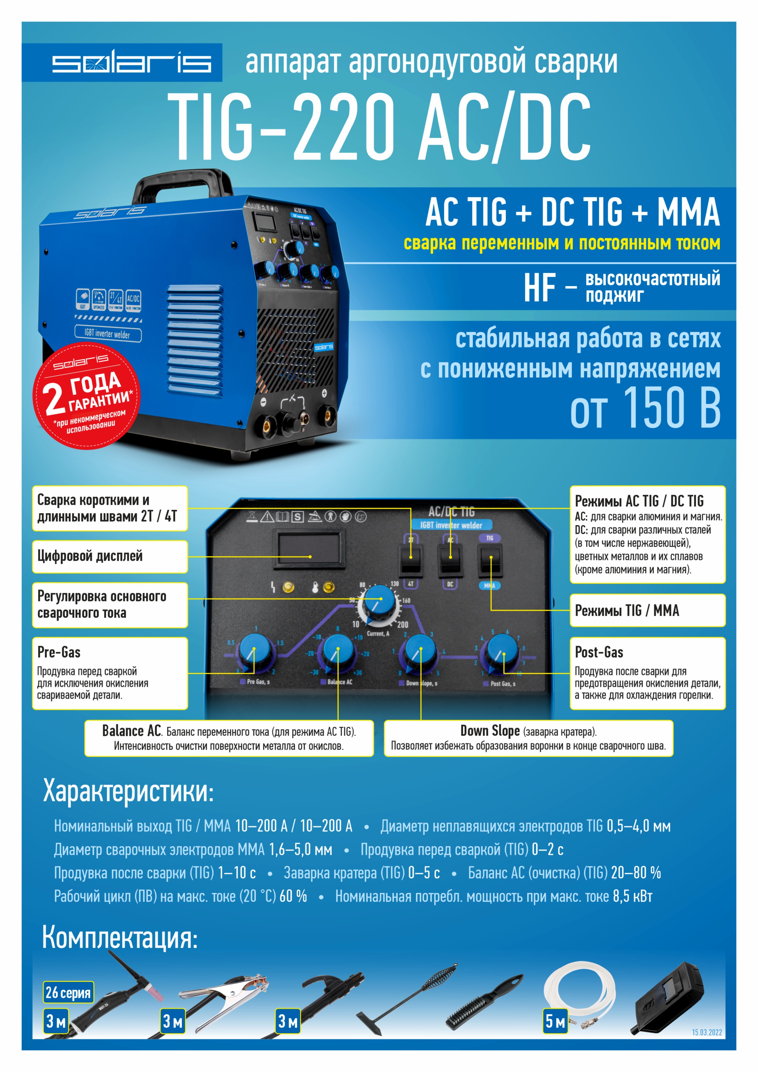Инверторный аппарат аргонодуговой сварки SOLARIS TIG-220 AC/DC (AC/DC TIG; HF; MMA; 200 A; 150 В-240 В)