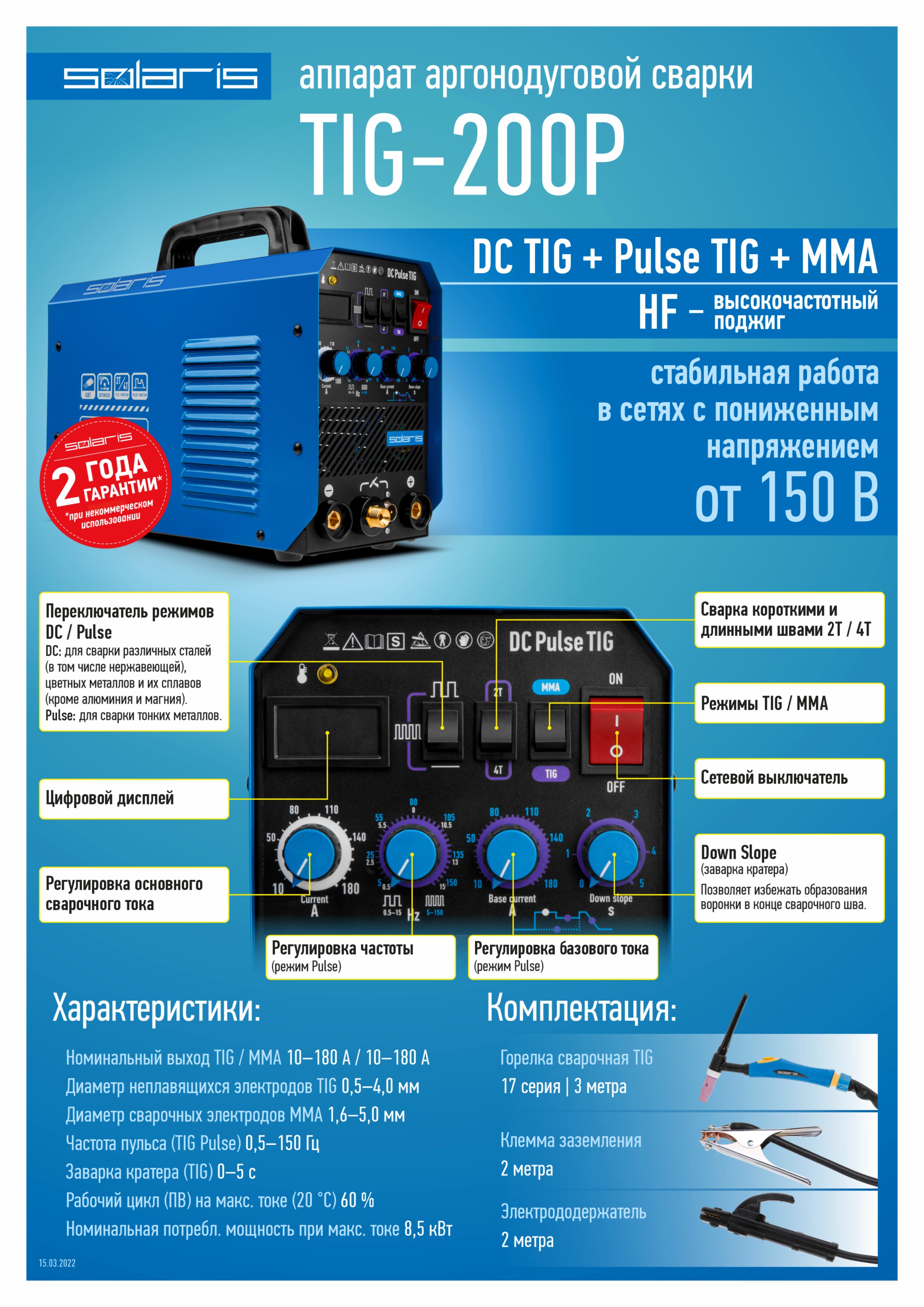 Инверторный аппарат аргонодуговой сварки SOLARIS TIG-200P (DC TIG; HF; Pulse; MMA; 180 A; 150 В-240 В)
