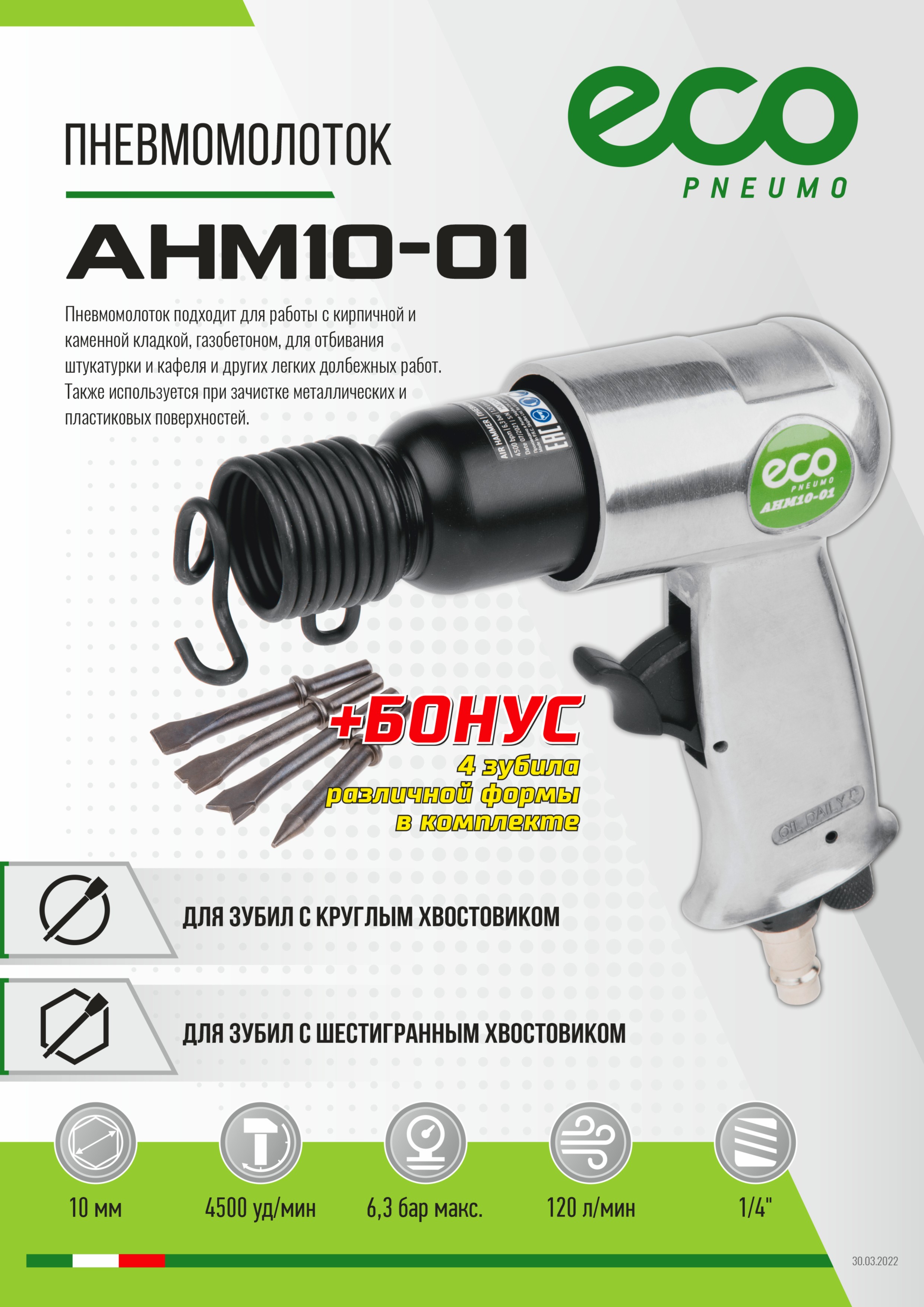 Пневмомолоток ECO AHM10-01 (4500 уд/мин; 1.12 Дж; 120л/мин; Хвостовик:10 мм; Долото - 4 шт.)