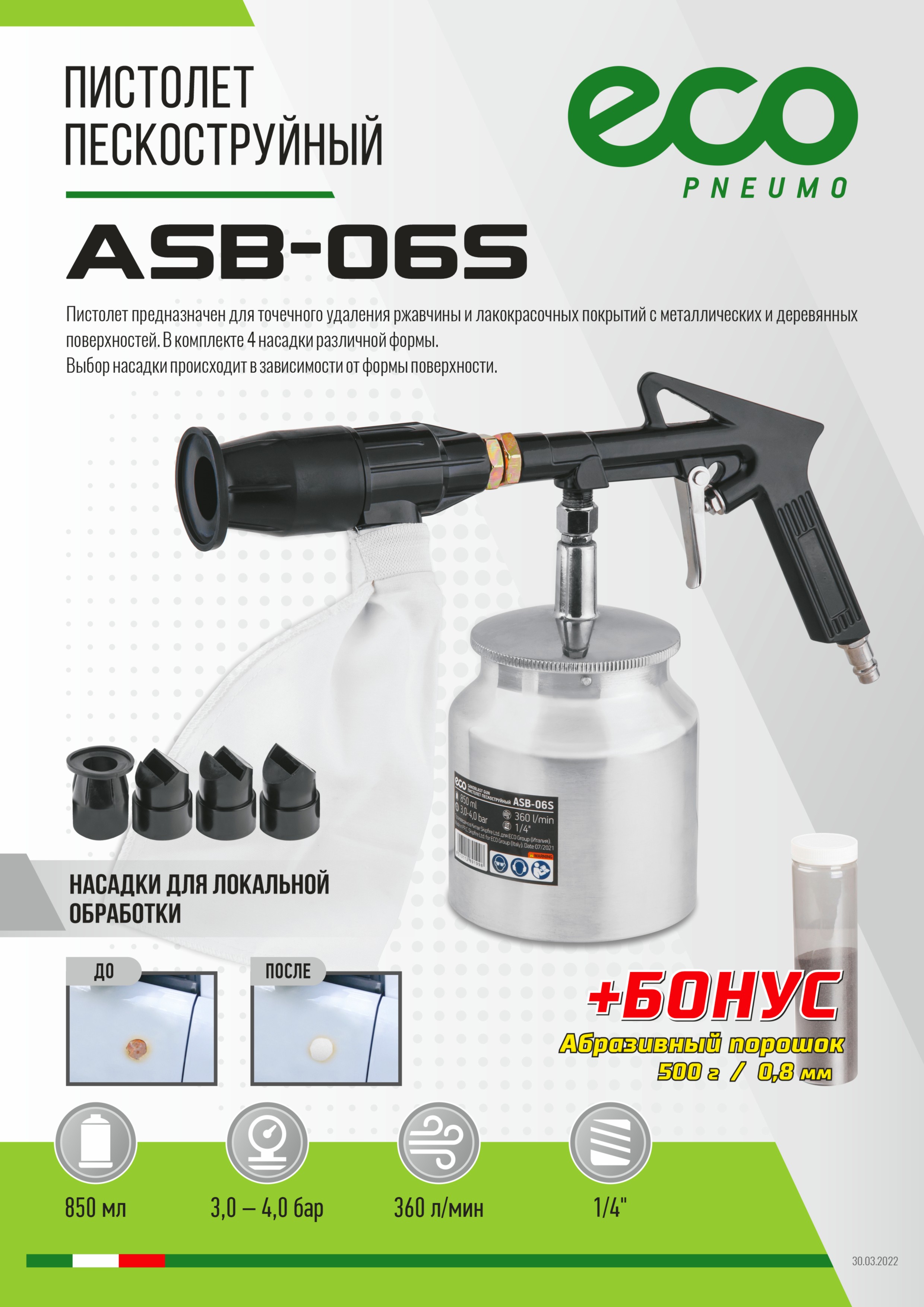 Пистолет пескоструйный с баком ASB-06S ECO (Рабочее давление: 3-4 бар; 360 л/мин; Резервуар: 850 мл;)