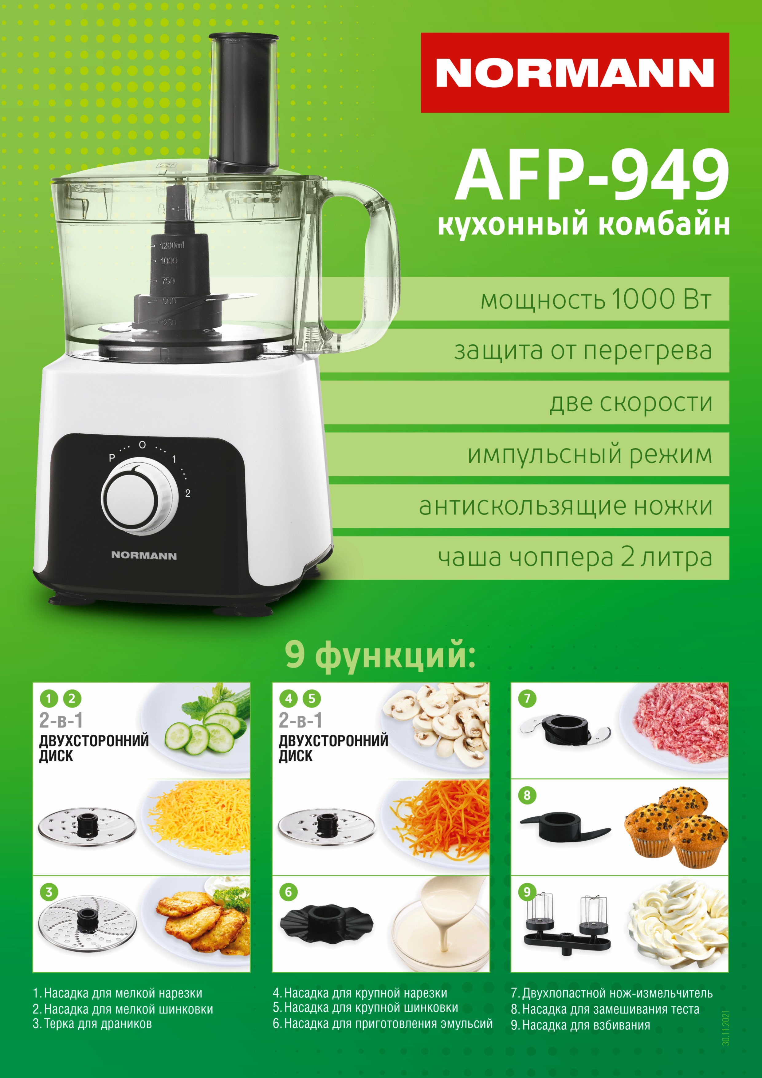 Кухонный комбайн NORMANN AFP-949 (1000 Вт; регул.скор.; 9 функций; чаша чоп. 2 л; терка для драников)
