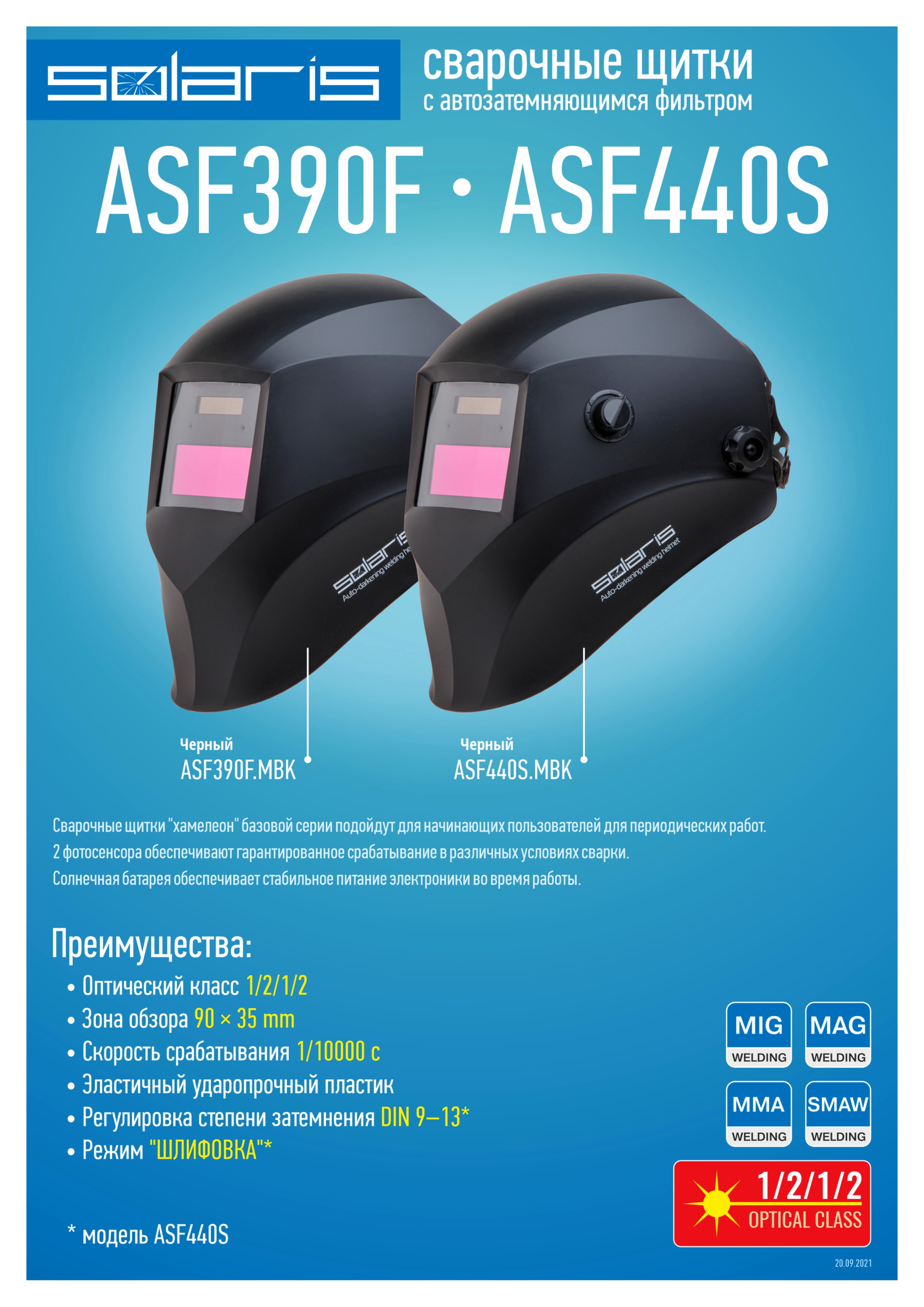 Щиток сварщика с самозатемняющимся светофильтром Solaris ASF440S (черный) (1/2/1/2; 90x35 мм (31,5 см2); DIN 4/9-13 (регулир.); шлифовка; сменная батарея)