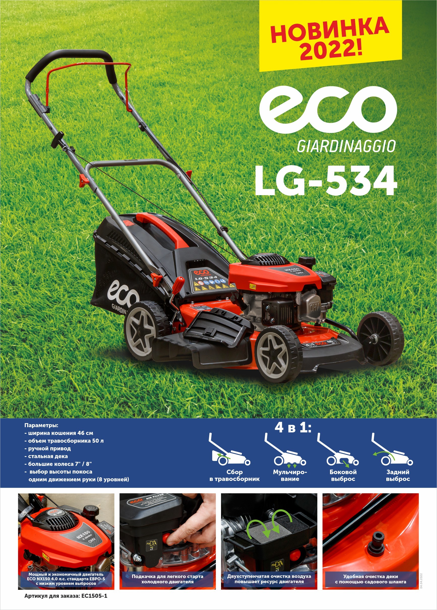 Газонокосилка бензиновая ECO LG-534 (4.0 л.с., шир. 46 см, ручной привод, мульчир., стальн.корпус, травосборник 50 л)