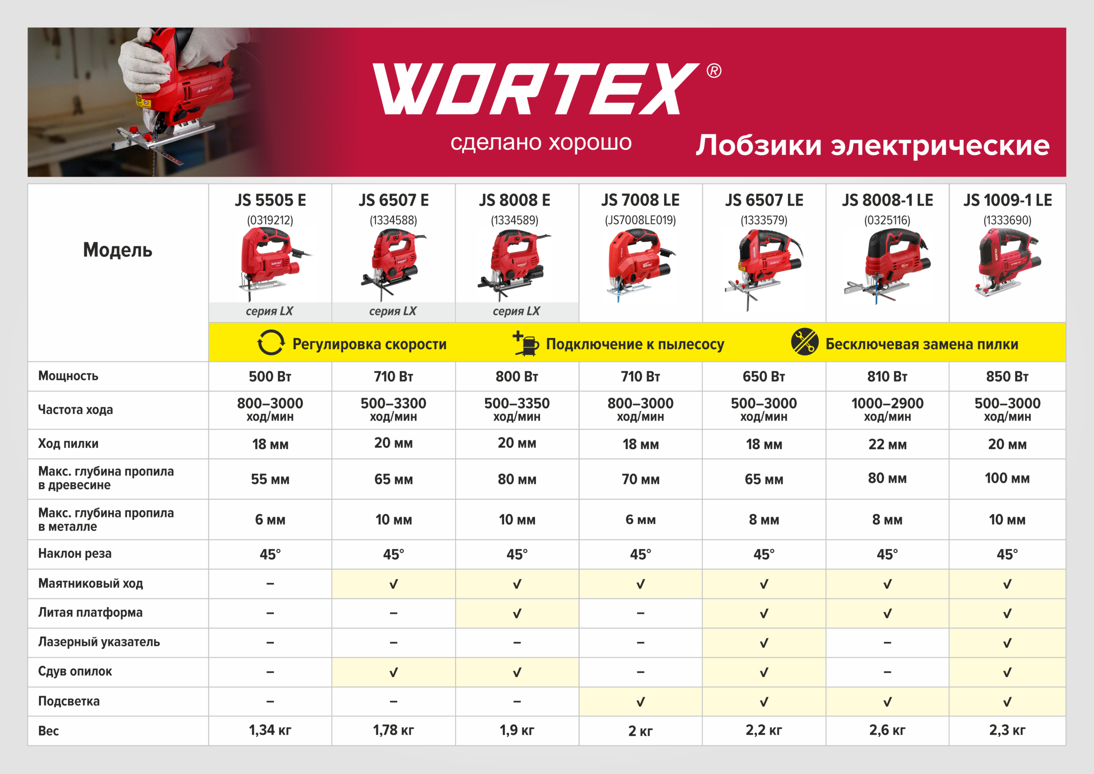 Лобзик электрический WORTEX JS 8008-1 LE в кор. 810 Вт, 0-2900 ход/мин, пропил до 80 мм. (Быстрозажимной патрон, маятниковый ход, рег. об., подсветка, литая платформа)