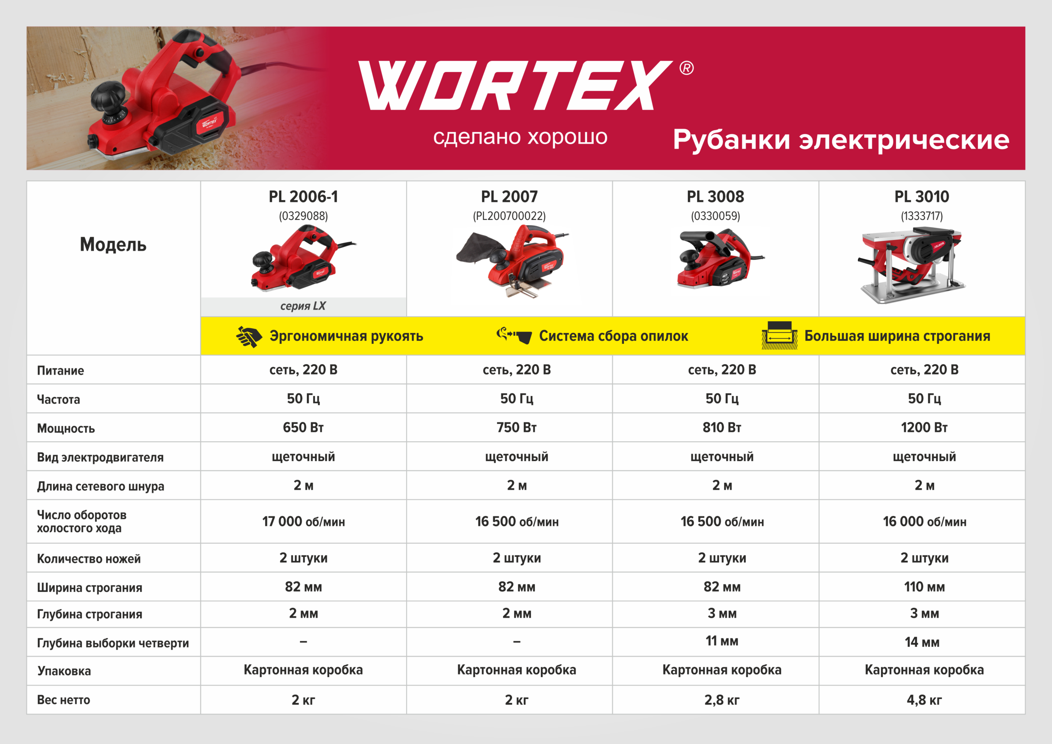 Рубанок электрический WORTEX LX PL 2006-1 в кор. 650 Вт, шир. до 82 мм, глуб. до 2.0 мм (Длина шнура 2 м, 2 кг.)