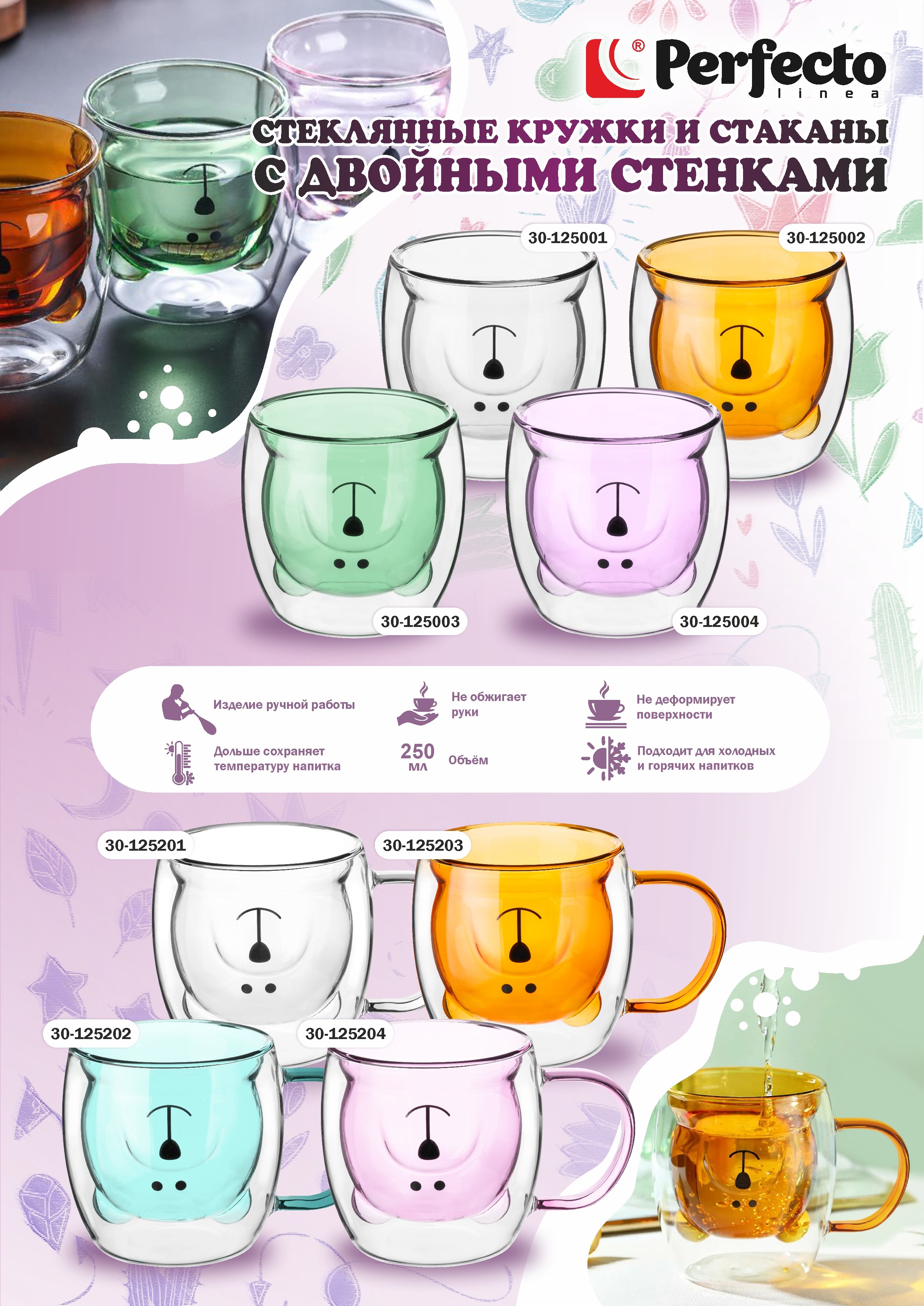 Кружка стеклянная ТМ PERFECTO LINEA серии Bear с двойными стенками выполнена из термостойкого боросиликатного стекла, которое выдерживает температуру от -20C до 280C. Ее можно использовать для горячих и холодных напитков. Корпус кружки благодаря особому составу стекла обладает уникальными характеристиками. Он тонкий, легкий и прочный одновременно. Прослойка воздуха между стенками сохраняет температуру напитков дольше обычного. Внешняя стенка кружки при этом остается холодной, даже если внутри кипяток. Если вы нальете в кружку ледяной напиток, то на внешней стенке не образуется конденсат. Напиток останется холодным, а стенка нейтральной, что удобно в летнее время. Поверхность устойчива к царапинам, она не помутнеет со временем даже при частом мытье в посудомоечной машине.