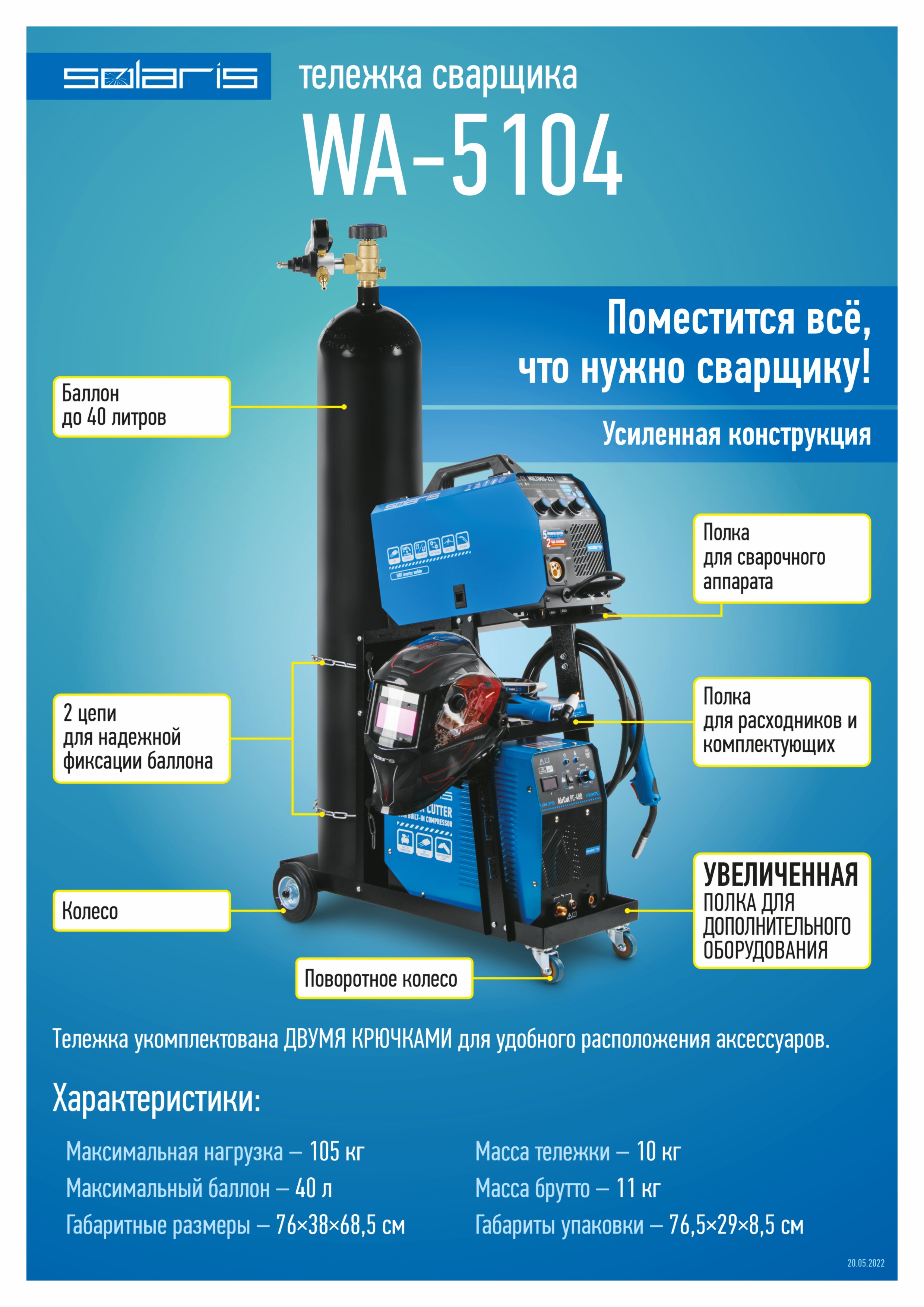 Тележка предназначена для использования в мастерских, производственных цехах и прочих объектах, где применяются сварочные работы для расположения на ней сварочных аппаратов, газовых баллонов, аксессуаров, расходных частей. Тележка имеет усиленную конструкцию для повышенной нагрузки до 105 кг. и размещения газового баллона до 40 л на специальной площадке. Оснащена колесами для легкого перемещения (2 -поворотные и 2 - неповоротные). Нижняя полка увеличена по сравнению с моделями WA-5102, 5103. Поставляется в разобранном виде.