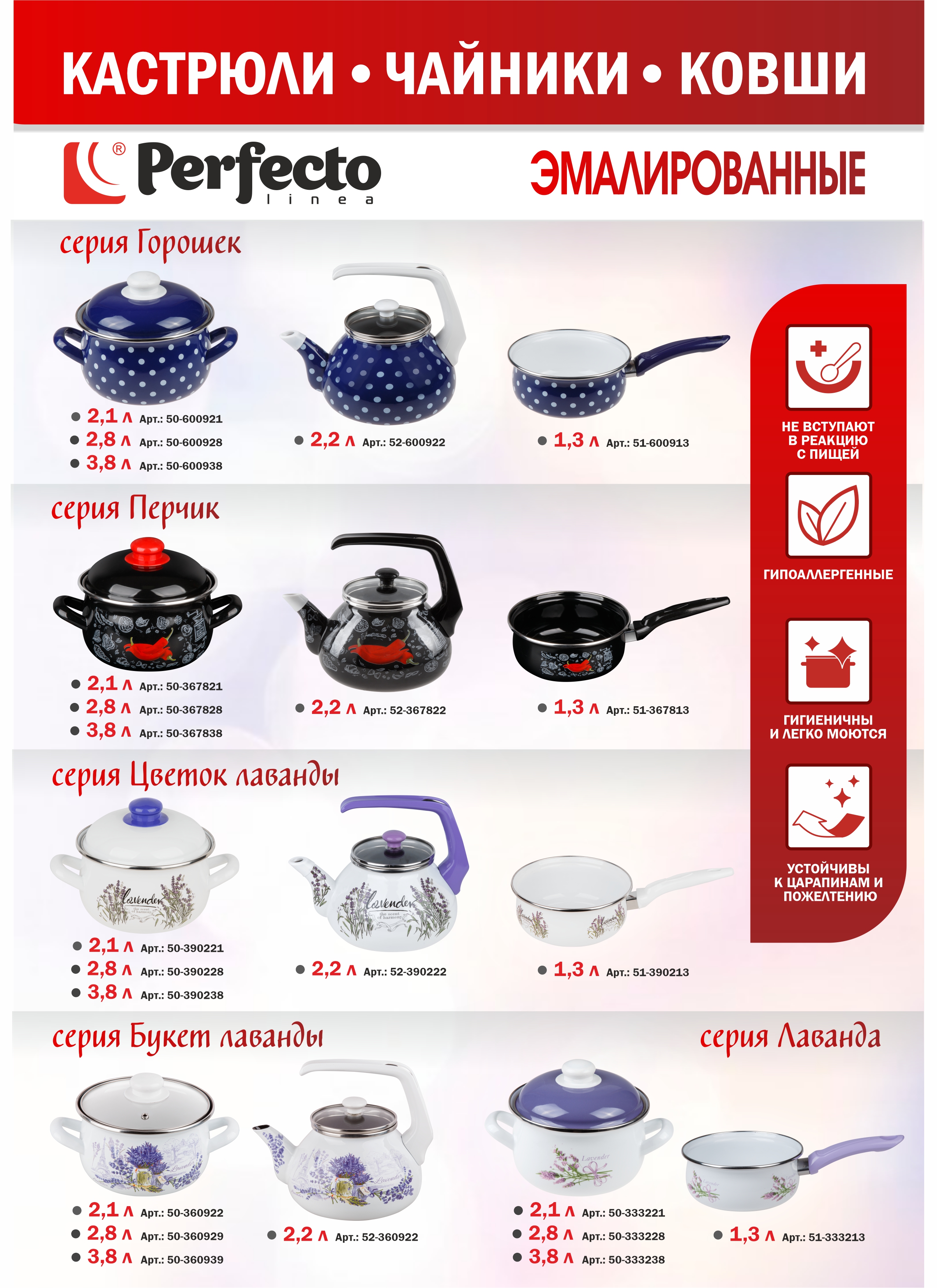 Кастрюля с деколью сферической формы. Стальные эмалированные ручки. Стальная эмалированная крышка с бакелитовой ручкой-кнопкой, нержавеющей окантовкой. Толщина стенок 0,8мм. Изготовлена из 5-тислоев: 1) Внутренний покровный слой эмали 2) Внутренний грунтовый слой эмали 3) Стальная основа 4) Наружный грунтовый слой эмали 5) Наружный покровный слой эмали Эмалированная стальная посуда ТМ Perfecto linea: -Не вступает в реакцию с едой -Гипоаллергенна -Безопасна -Гигиенична и легко моется -Можно мыть в посудомоечной машине -Устойчива к царапинам и пожелтению -Универсальна- подходит ко всем типам плит -Предназначена для приготовления пищи, хранения, сервировки стола и других хозяйственных нужд -Изготовлена из высококачественной стали, покрытой двумя слоями стеклоэмали (грунт и покров) Правила безопасного и эффективного использования эмалированной посуды: -Перед первым использованием рекомендуется вымыть теплой водой с жидким моющим средством -Использовать по назначению -Не ставить пустую посуду на источники тепла -Диаметр источника тепла должен быть равным либо меньшим диаметру дна изделия -При перегревании посуды, не охлаждать холодной водой, дать остыть до комнатной температуры -Не допускать замерзания жидкости в изделии -Оберегать от сильных ударов и падений -Не использовать в духовом шкафу изделия с бакелитовыми ручками и не допускать контакт бакелитовых частей с источником тепла. -Используйте специальные кухонные прихватки и рукавицы во избежаниеожогов -Не предназначена для использования в микроволновых печах -Запрещается использовать изделие при наличии скола эмали на внутренней поверхности -Для очистки изделий не используйте жесткие губки и абразивные моющие средства -Для удаления накипиосадка используйте специальные средства от накипи Соблюдая перечисленные правила, можно баловать своих близких самыми изысканными блюдами, используя эмалированную посуду ТМ Perfecto linea