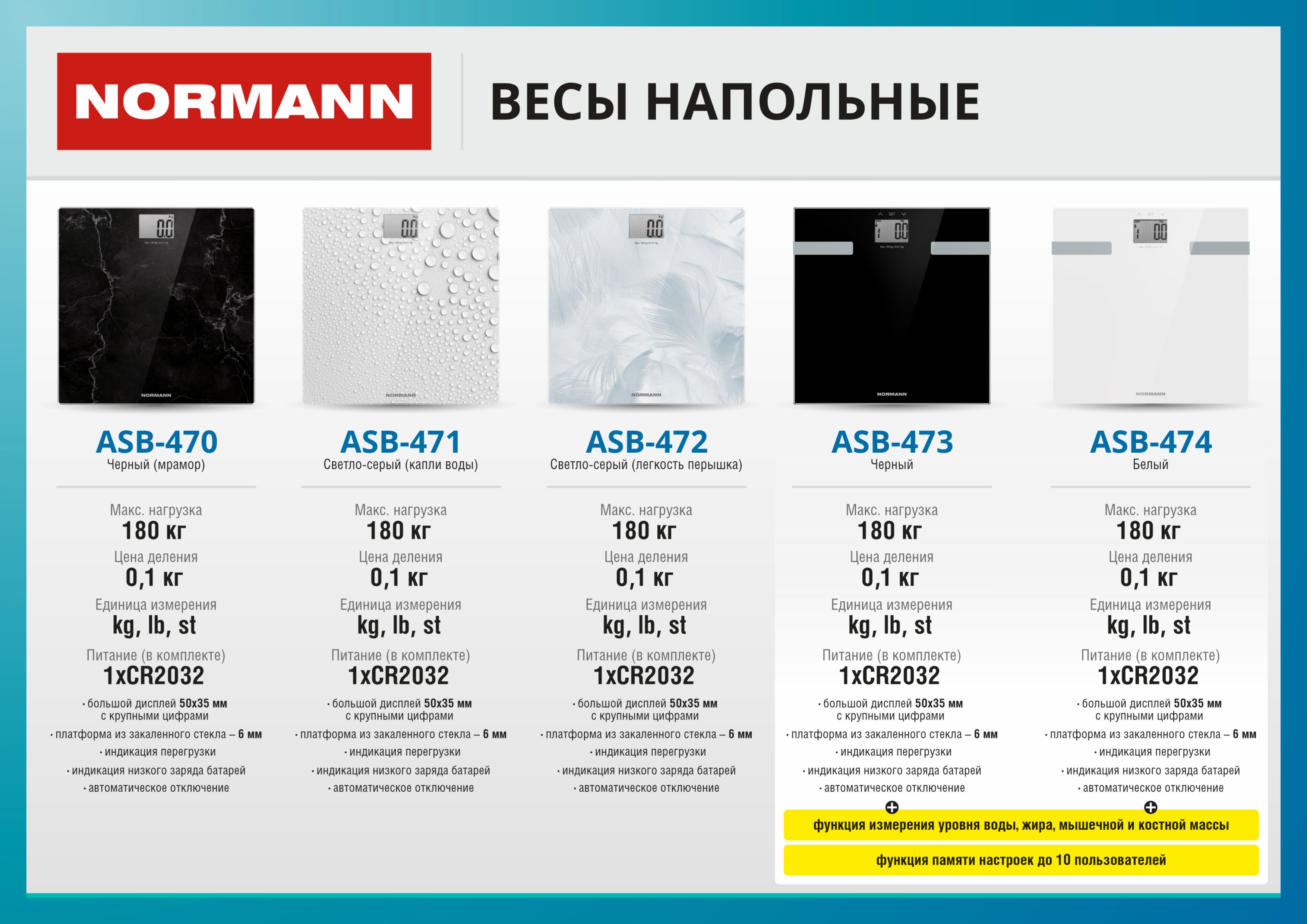 Весы напольные ASB-474 NORMANN (180 кг; стекло 6 мм; дисплей 50х35 мм; изм-ние уровня воды,жира, мышечной массы)