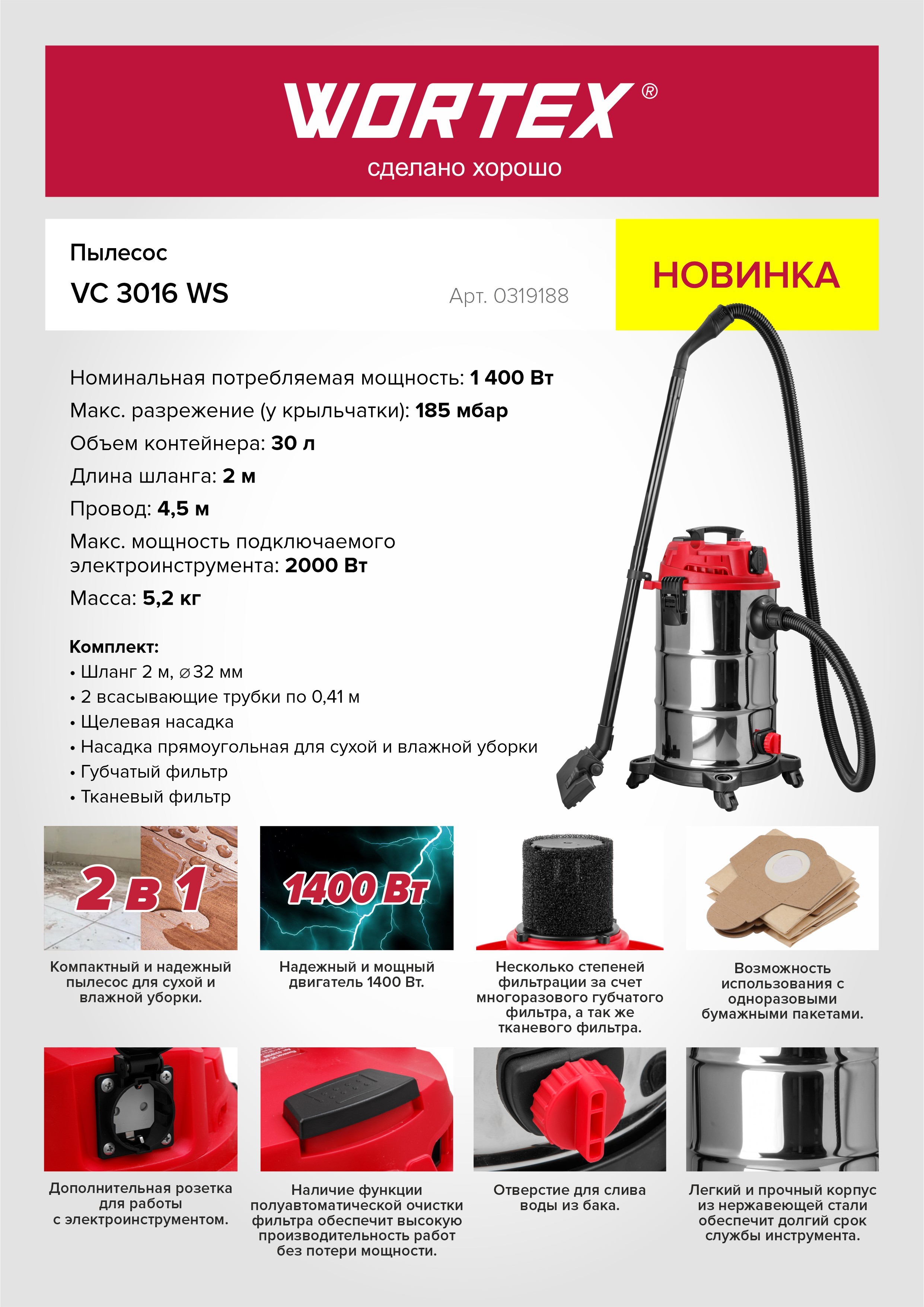 Компактный и надежный пылесос для сухой и влажной уборки, а так же с дополнительной розеткой для работы с электроинструментом. В базовую комплектацию входит шланг 2 м , а так же электрический провод 4,5 м, для большего удобства в работе. Надежный и мощный двигатель 1400 Вт. Несколько степеней фильтрации обеспечивается за счет многоразового губчатого фильтра, а так же фильтра тонкой очистки (HEPA), который идет в комплекте. Возможно также использовать с одноразовыми бумажными пакетами. Наличие функции полуавтоматической очистки фильтра обеспечит высокую производительность работ без потери мощности. Пылесос также оснащен специальным отверстием для слива воды из бака. А легкий и прочный корпус из нержавеющей стали обеспечит долгий срок службы инструмента. Функция выдува. Гарантийный срок - 2 года.