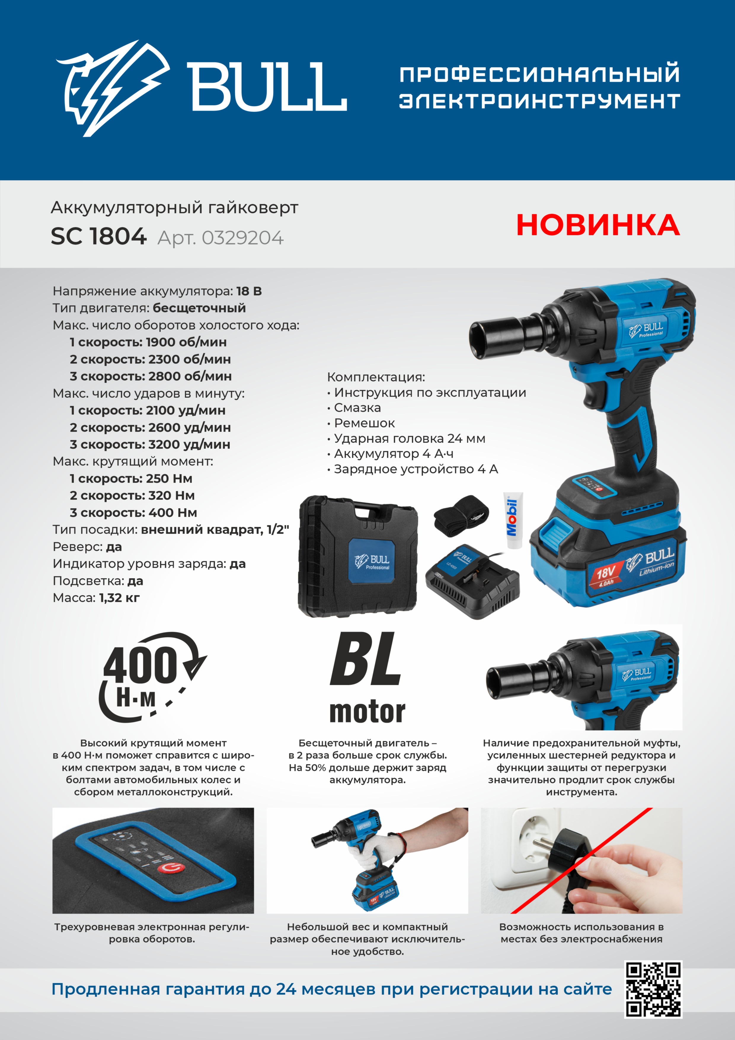 Компактный гайковерт отличается высоким крутящим моментом 400 Нм, возможностью использования в местах без электроснабжения. Модель имеет бесщеточный двигатель, что способствует повышенной устойчивости к нагрузкам, обеспечивает легкость инструмента, простоту в его обслуживании. Для точности в работе гайковерт оснащен трехуровневой электронной регулировкой оборотов. Удобству пользователя способствует индикатор уровня заряда, подсветка, обрезиненная рукоятка. А наличие предохранительной муфты и функции защиты от перегрузки значительно продлит срок службы инструмента. Гарантийный срок - 12 месяцев. И возможность продлить гарантию до 24 месяцев при регистрации на сайте: https:bull-pt.comwarrantys