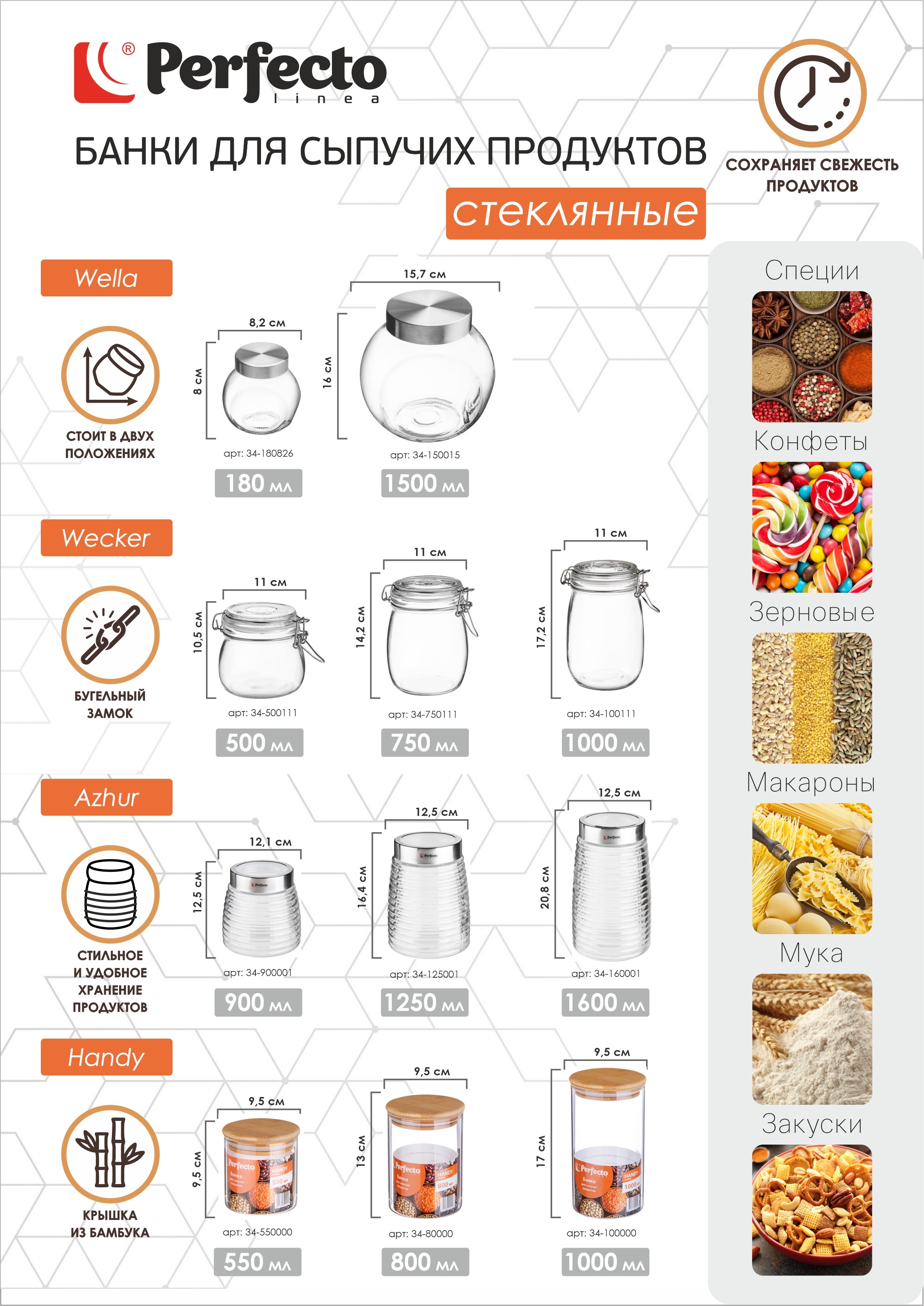 Банка PERFECTO linea Wella это качественное хранение сыпучих продуктов и создание идеальной чистоты и порядка на кухне. Банка изготовлена из прочного стекла. Форма банки Wella выпуклая и шарообразная, объем 1.5 л. Срезанные под разным углом стороны, дают возможность ставить банку на бочок, так удобно доставать нужные продукты. Банка закрывается стильной, удобной металлической крышкой серебристого цвета. В банке прекрасно хранятся специи, бобовые, макаронные изделия. Разные крупы удобно пересыпать из пакетов удобную и стильную банку Wella. Банка отлично смотрится на полочках, прозрачное стекло позволяет быстро найти нужный продукт, не открывая крышку. Все продукты будут упорядочены, в них не заведутся мелкие насекомые, они не отсыреют и не впитают лишних запахов. Любителям орешков и сухофруктов будет удобно хранить полезные продукты в стеклянной банке с крышкой. Производит практичную и красивую банку Wella известный испанский бренд PERFECTO linea. Посуда сочетает в себе эстетичный вид, повышенную прочность, износостойкость и низкую стоимость.