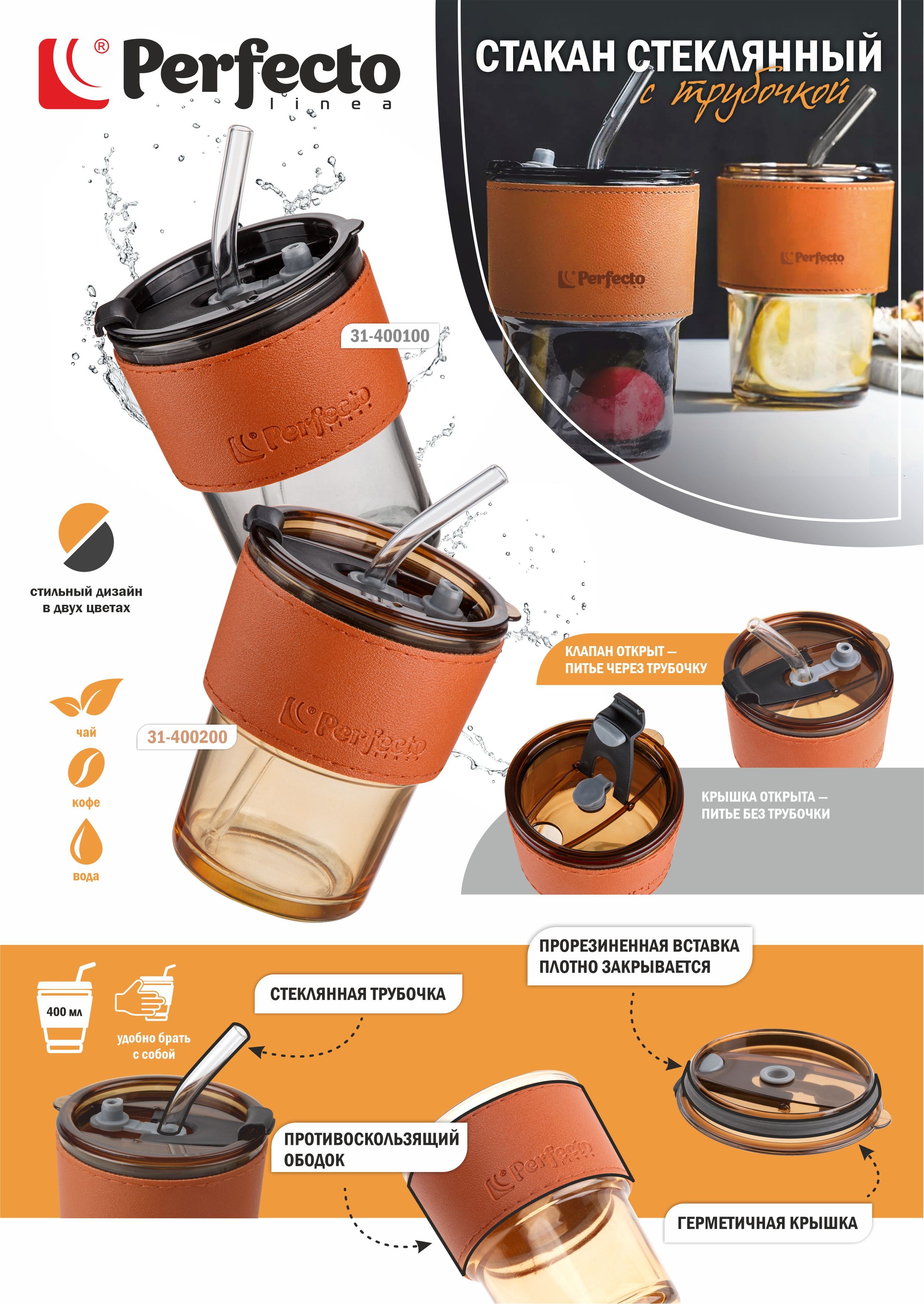 Стильный стеклянный стакан с трубочкой PERFECTO LINEA заменит одноразовые пластиковые или бумажные стаканчики. В комплект входит герметичная крышка, кожаный кейс, стеклянная многоразовая трубочка. Объем кружки составляет 400 мл. Стакан непроливайка, идеален для улицы или для машины. Используйте его для холодных и горячих напитков: для кофе и чая, воды с лимоном, лимонада, свежевыжатого сока, смузи, глинтвейна. Добавьте лед и побалуйте себя вкусным коктейлем. Кожаный кейс защищает руки от горячих и холодных напитков. Эргономичная форма и стильный цвет стекла делают ее универсальным как для мужчин, так и для женщин и даже детей. Стеклянная посуда прочно вошла в моду, что делает стакан Perfecto Linea красивым аксессуаром и достойным подарком на любой праздник. В отличие от железных термокружек, стекло не впитывает запахи, легко моется, приятно на ощупь. Классическая форма позволяет разместить кружку в любом подстаканнике, будь то машина или детская коляска. Крышка выполняет 2 функции: можно пить просто из стакана или вставить стеклянную трубочку. Подойдет на каждый день и особенный случай: используйте его для дома, в офисе, на фотосессии, в качестве кофейной кружки. Стакан представлен в двух расцветках, поэтому вы сможете составить идеальный подарочный набор для пары. Для сохранения герметичности не рекомендуем мыть крышку в посудомоечной машине на высоких температурах. Рекомендованная температура использования стакана не более 70C. Не подвергать резким перепадам температур.
