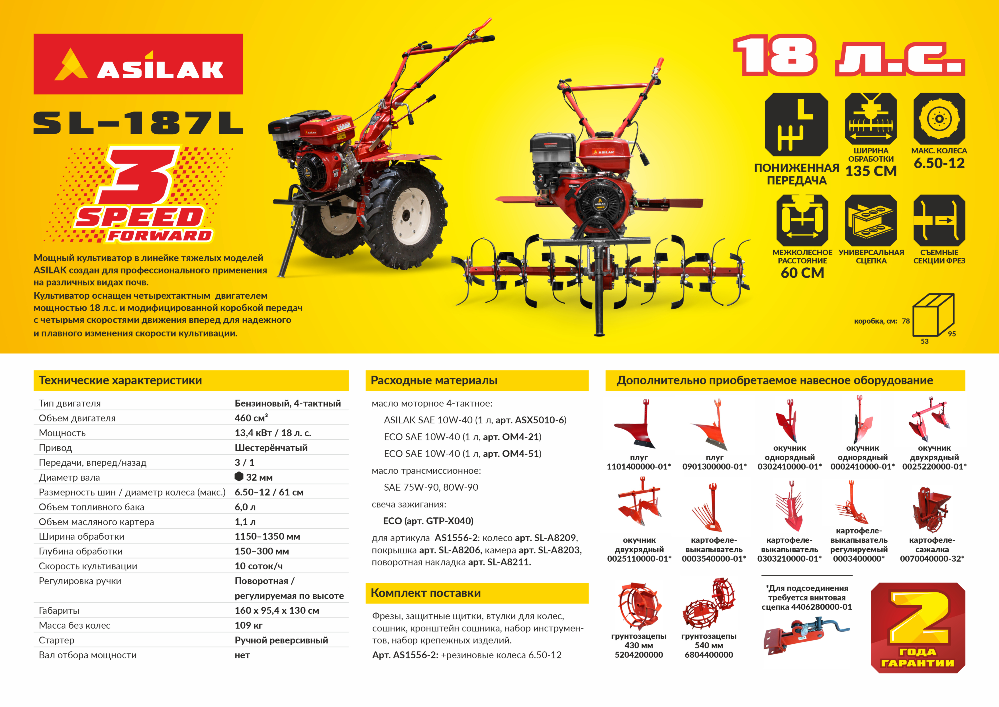 Культиватор бензиновый ASILAK SL-187L колёса 6.50-12 (18 л.с., 3 скорости вперёд - ПОНИЖЕННАЯ СКОРОСТЬ, шир. 135 см, колеса 6.50-12, без ВОМ)
