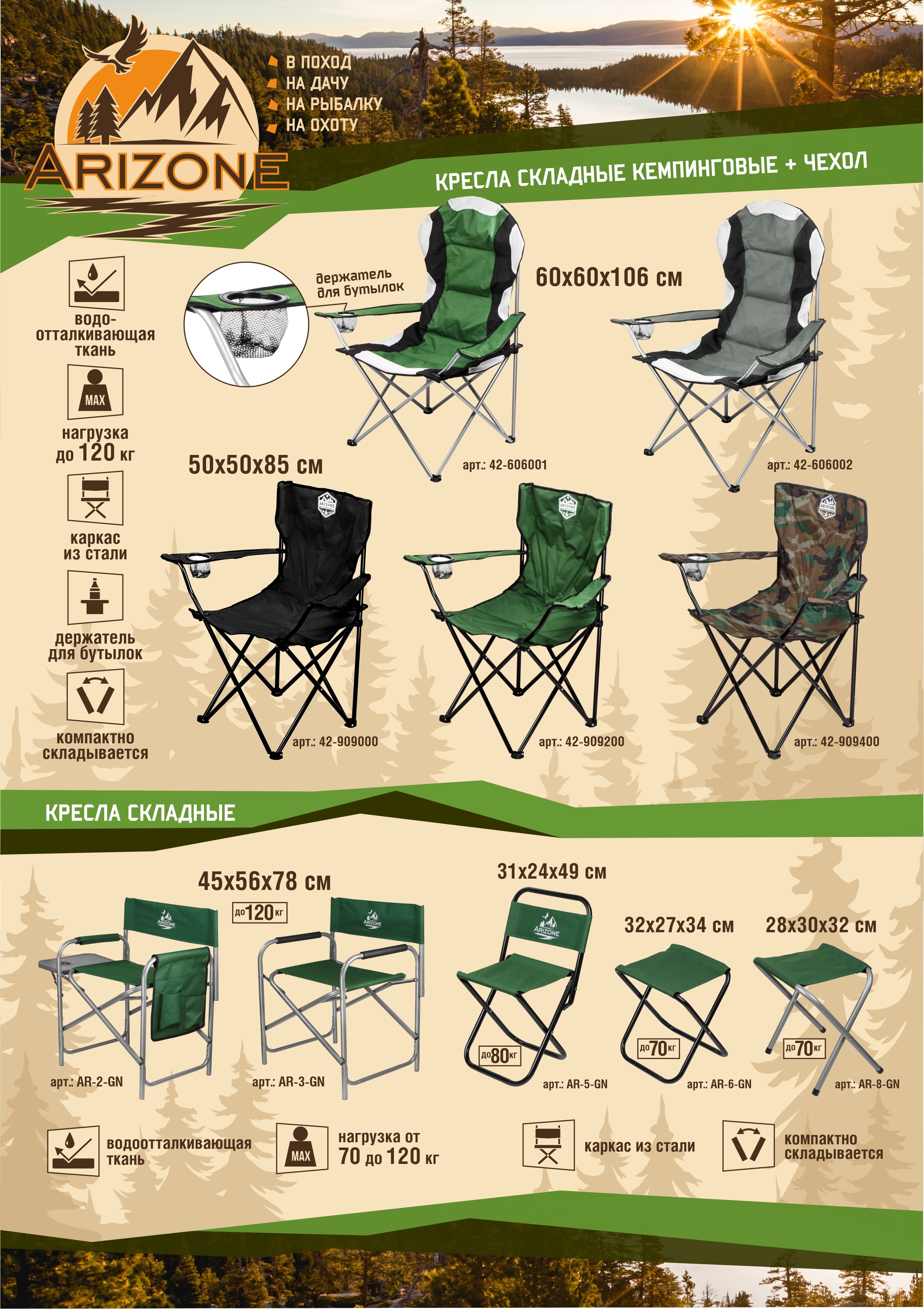 Кресло складное кемпинговое с держателем для бутылок + чехол, зеленое, серия Coyote, ARIZONE