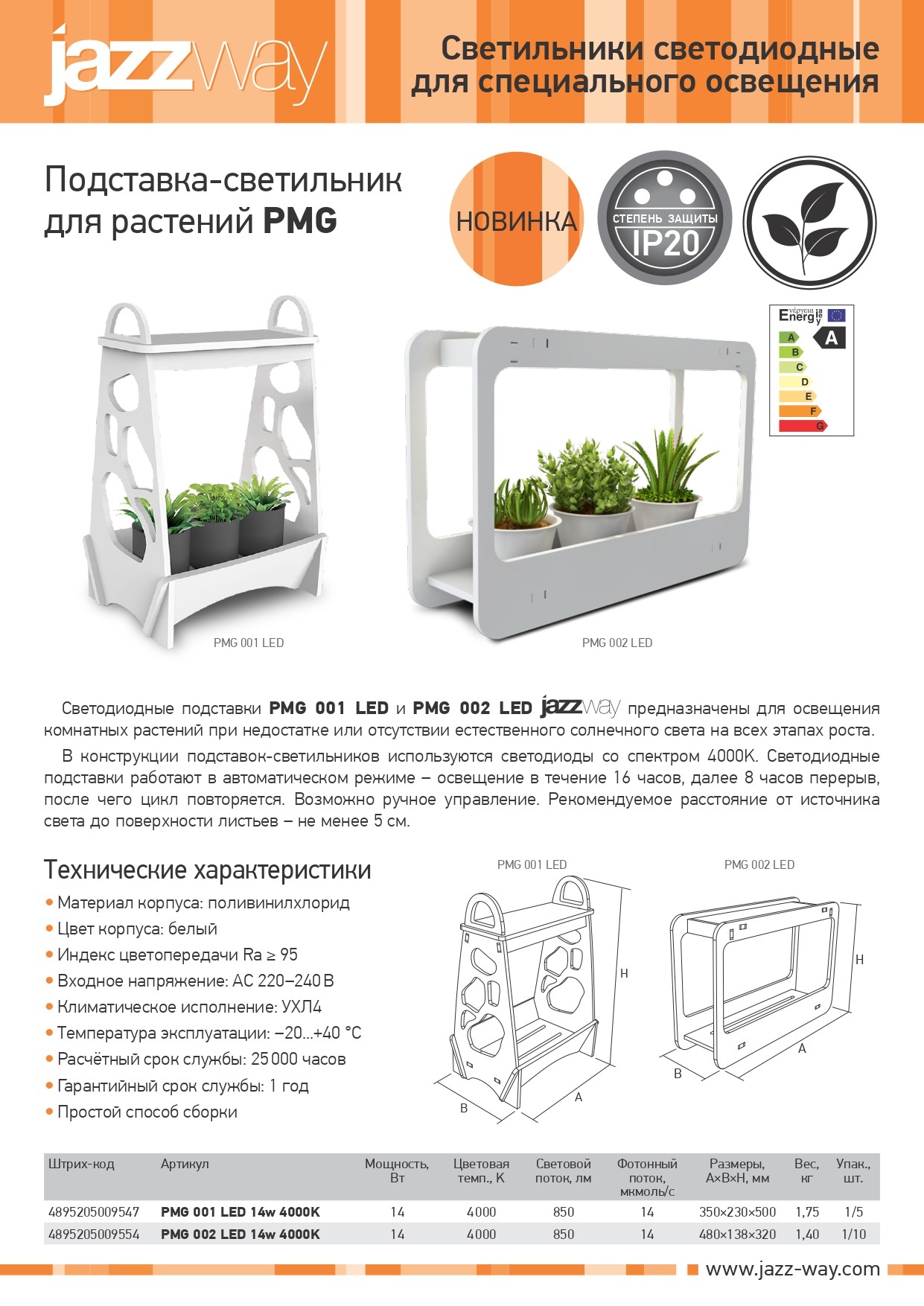 Cветодиодные подставки PMG 001 LED и PMG 002 LED предназначены для освещения комнатных растений при недостатке или отсутствии естественного солнечного света на всех этапах роста. В конструкции подставок-светильников используются светодиоды со спектром 4000K. Светодиодные подставки работают в автоматическом режиме освещение в течение 16 часов, далее 8 часов перерыв, после чего цикл повторяется. Возможно ручное управление. Рекомендуемое расстояние от источника света до поверхности листьев не менее 5 см.
