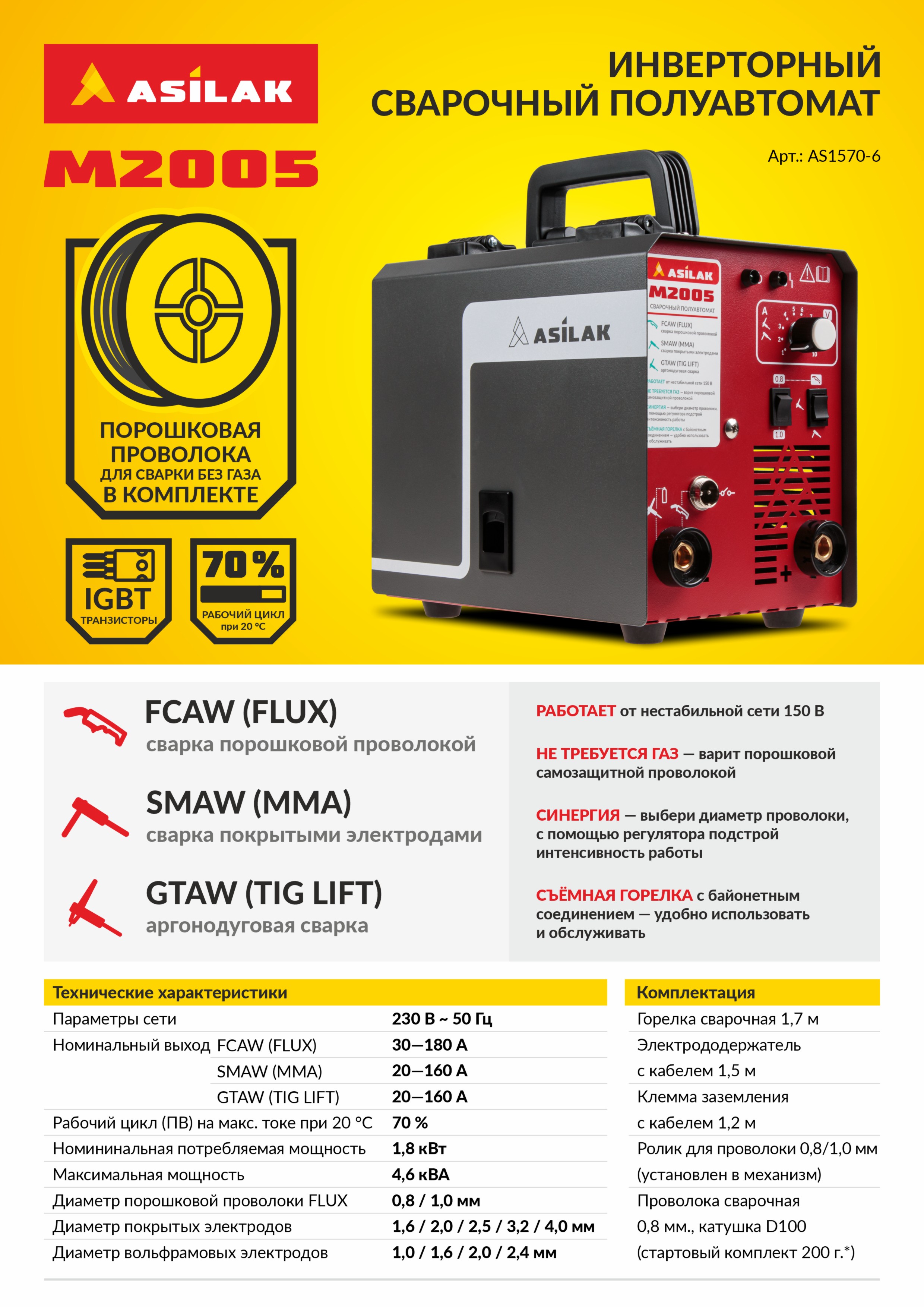 Полуавтомат сварочный ASILAK M2005 (230В; 20-180 А; 80В; FLUX/MMA/TIG LIFT; байонетный разъем; без подкл. газа)