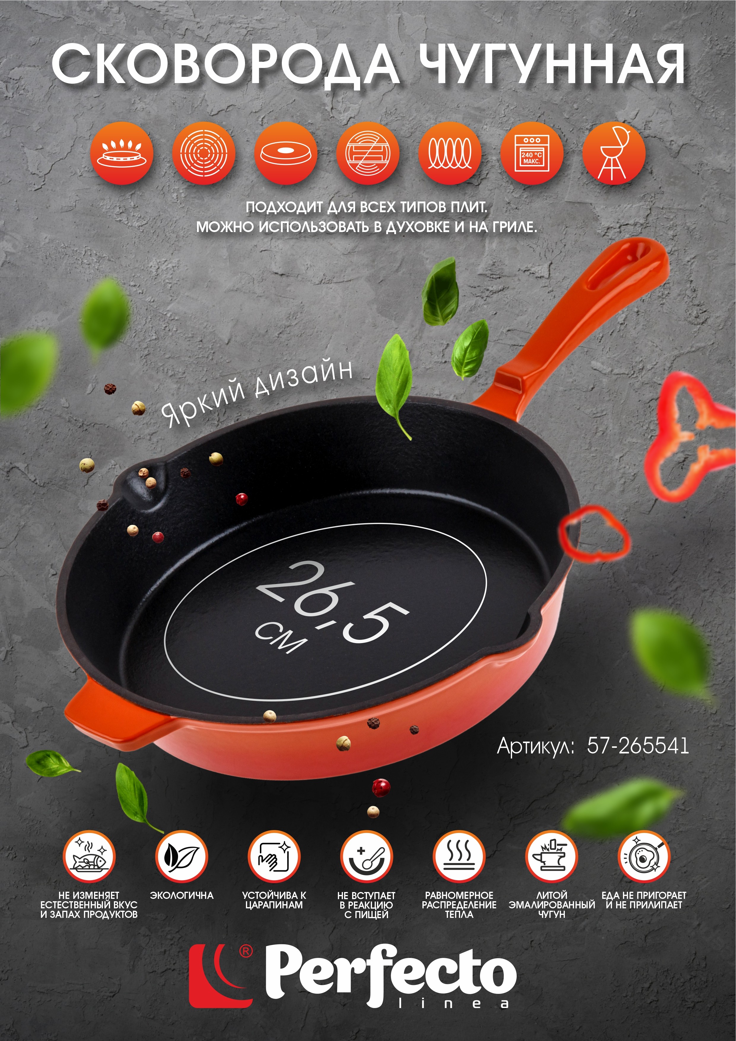 Сковорода чугунная ф 26,5х5,4 см с ручкой, PERFECTO LINEA (Покрытие: эмаль)