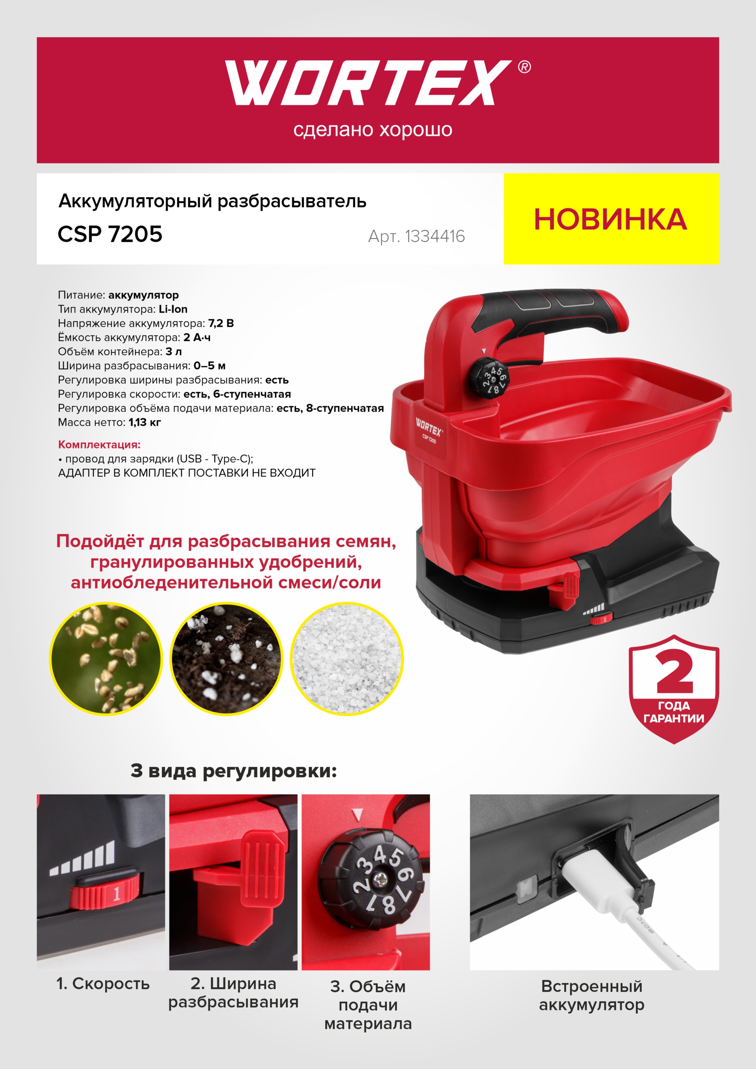 Аккум. разбрасыватель WORTEX CSP 7205 в кор. Встр. акб 7,2 В, 2 А/ч, конт. 3 л., шир. 5 м. (Регулировка ширины, скорости, объёма.)