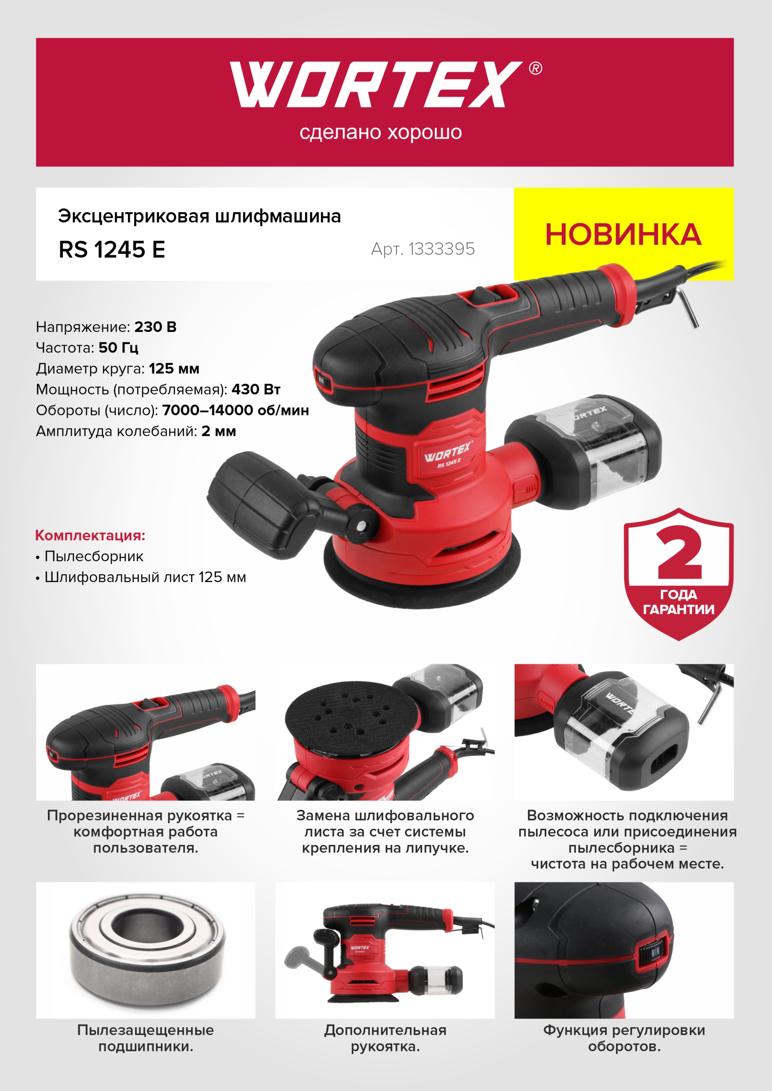 Эксцентриковая шлифмашина WORTEX RS 1245 E в кор. 430 Вт, 125 мм, 7000-14000 об/мин (Амплитуда колебаний 2 мм, регул. об., доп. рукоятка.)