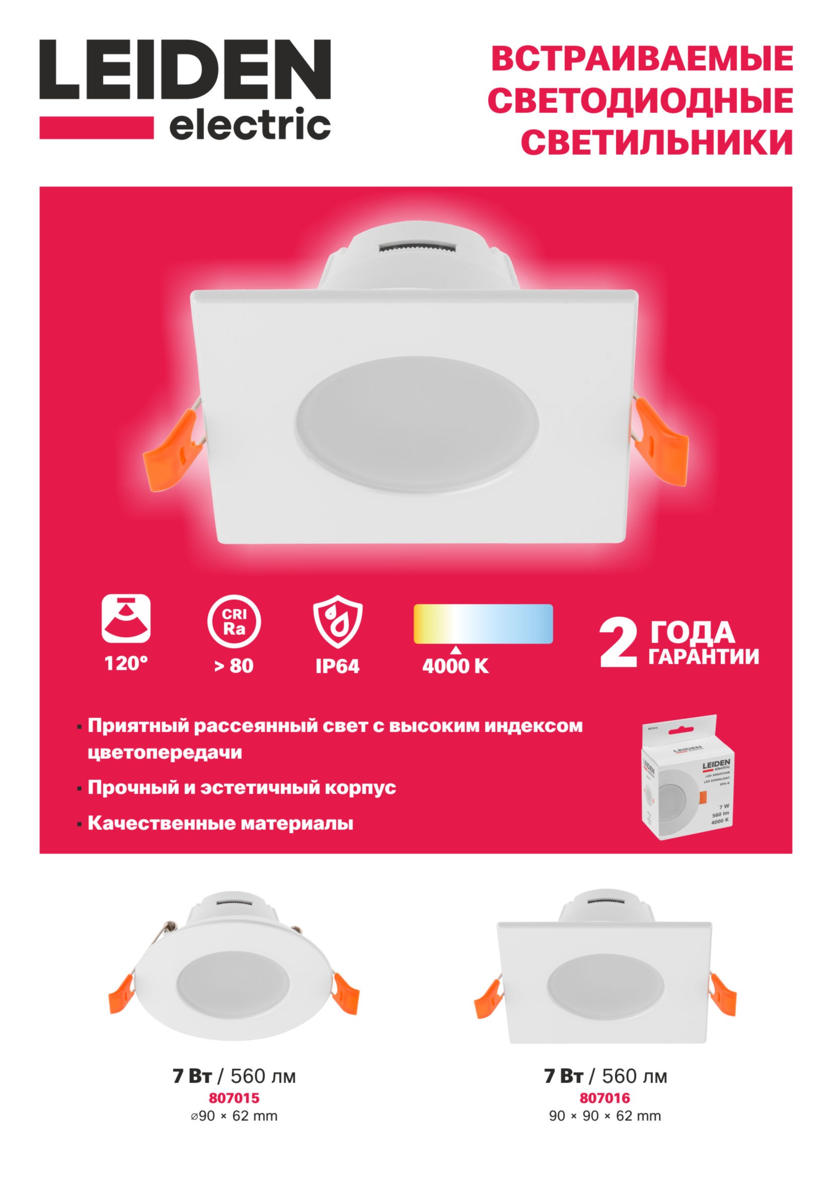 Светильник светодиодный встраиваемый квадрат 7 Вт 4000К, IP64 SPS-S LEIDEN ELECTRIC (90*90 мм)