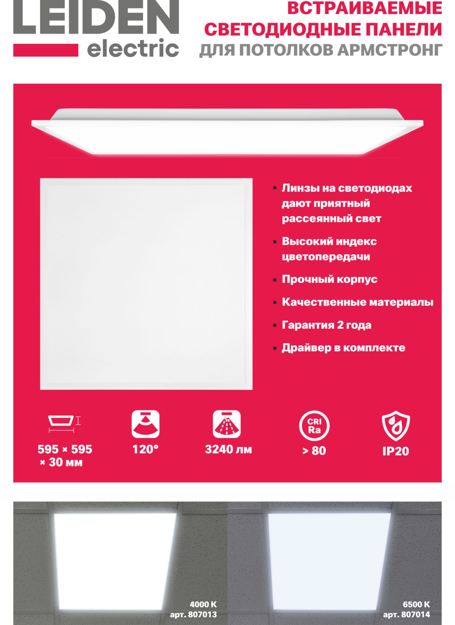 Панель светодиодная LEIDEN ELECTRIC предназначена для использования в качестве основного и дополнительного освещения административных, технических, вспомогательных, жилых и других помещений. Прочный эстетичный корпус впишется в любой интерьер. При создании светильника были использованы только качественные материалы. Приятный рассеянный свет, благодаря линзам на светодиодах, с высоким индексом цветопередачи позволяет комфортно чувствовать себя внутри помещений. Драйвер в комплекте позволяет подключить светильник напрямую к сети 230В. Благодаря стандартным размерам и малой высоте светильник можно смонтировать практически на любые потолки типа Армстронг.