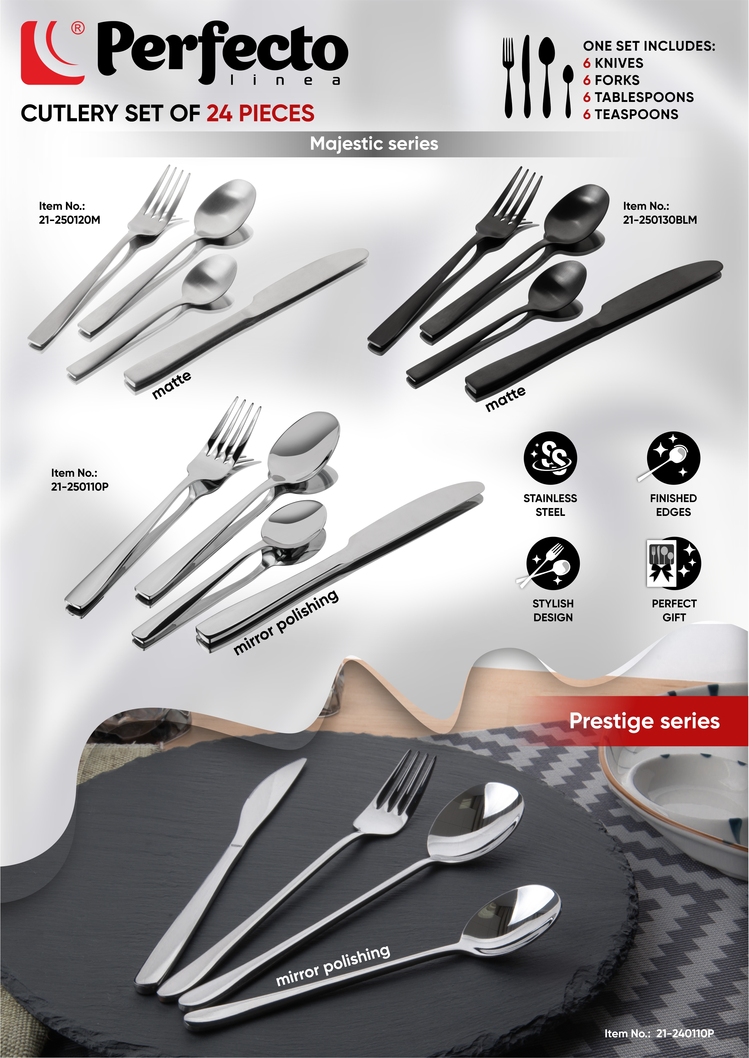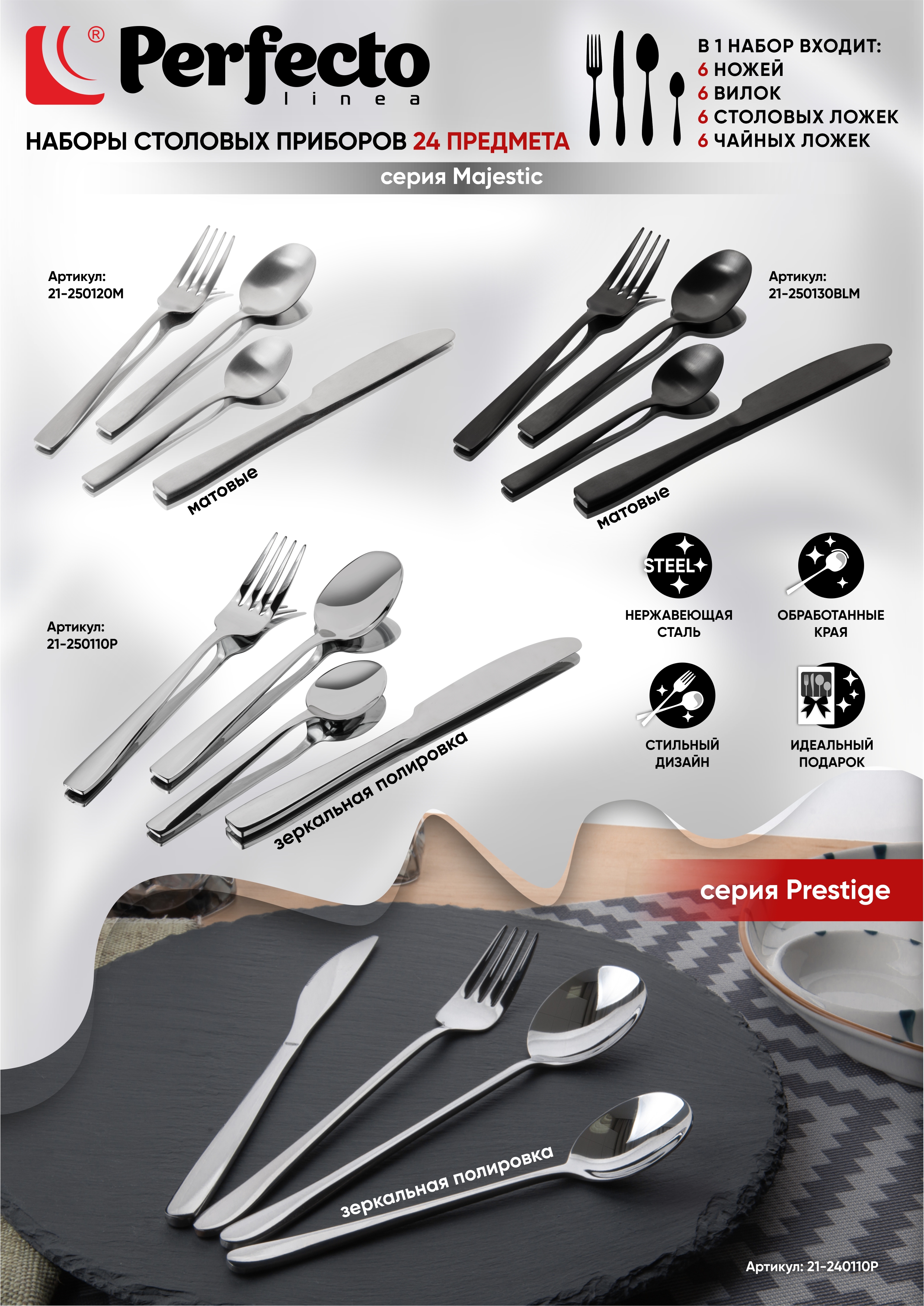 Набор столовых приборов, 24 шт., черный матовый, серия Majestic, PERFECTO LINEA