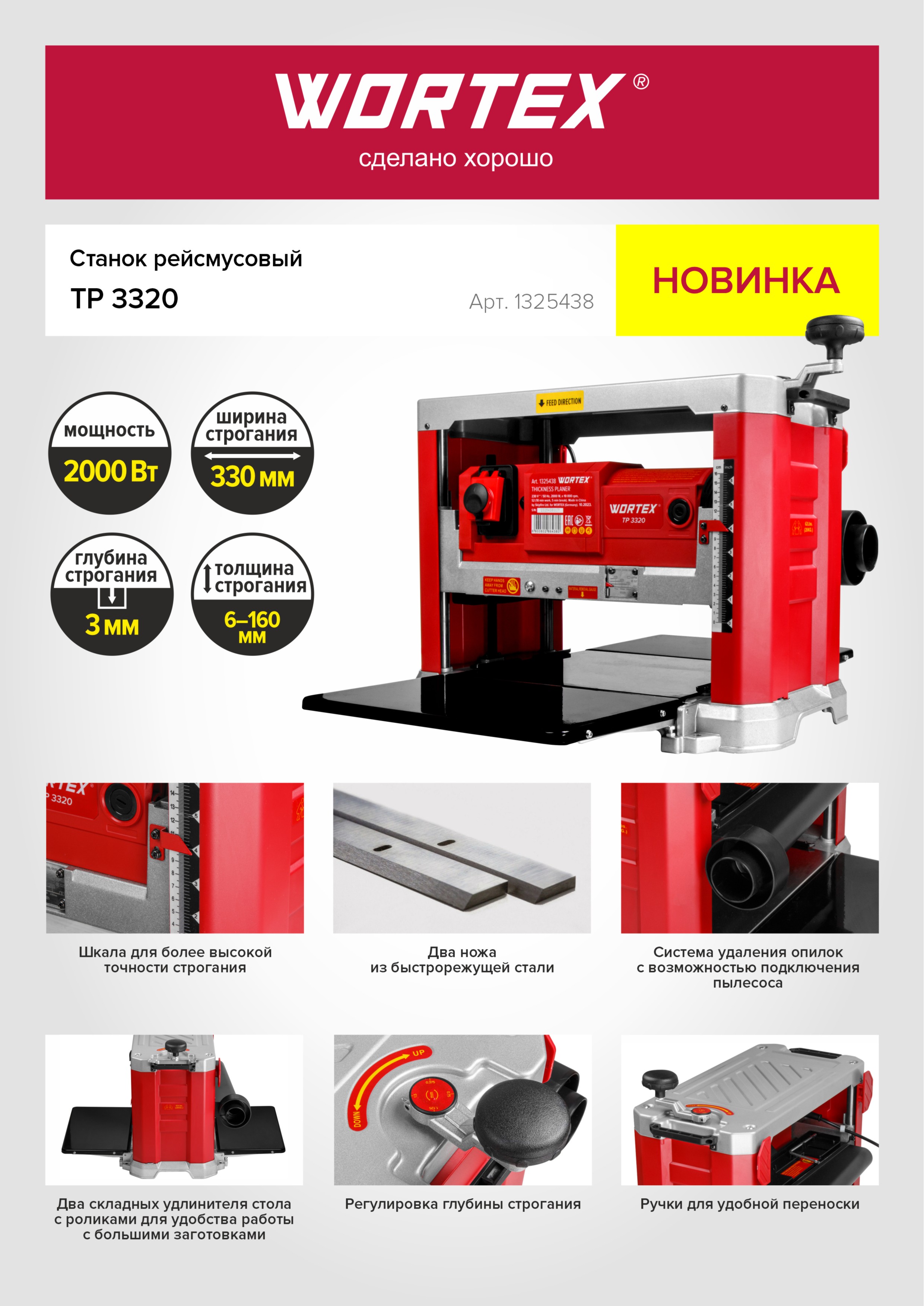 Станок рейсмусовый WORTEX TP 3320 (2000 Вт, ширина обработки 330 мм, глубина 3 мм, высота 6-160 мм, 10 000 об/мин)