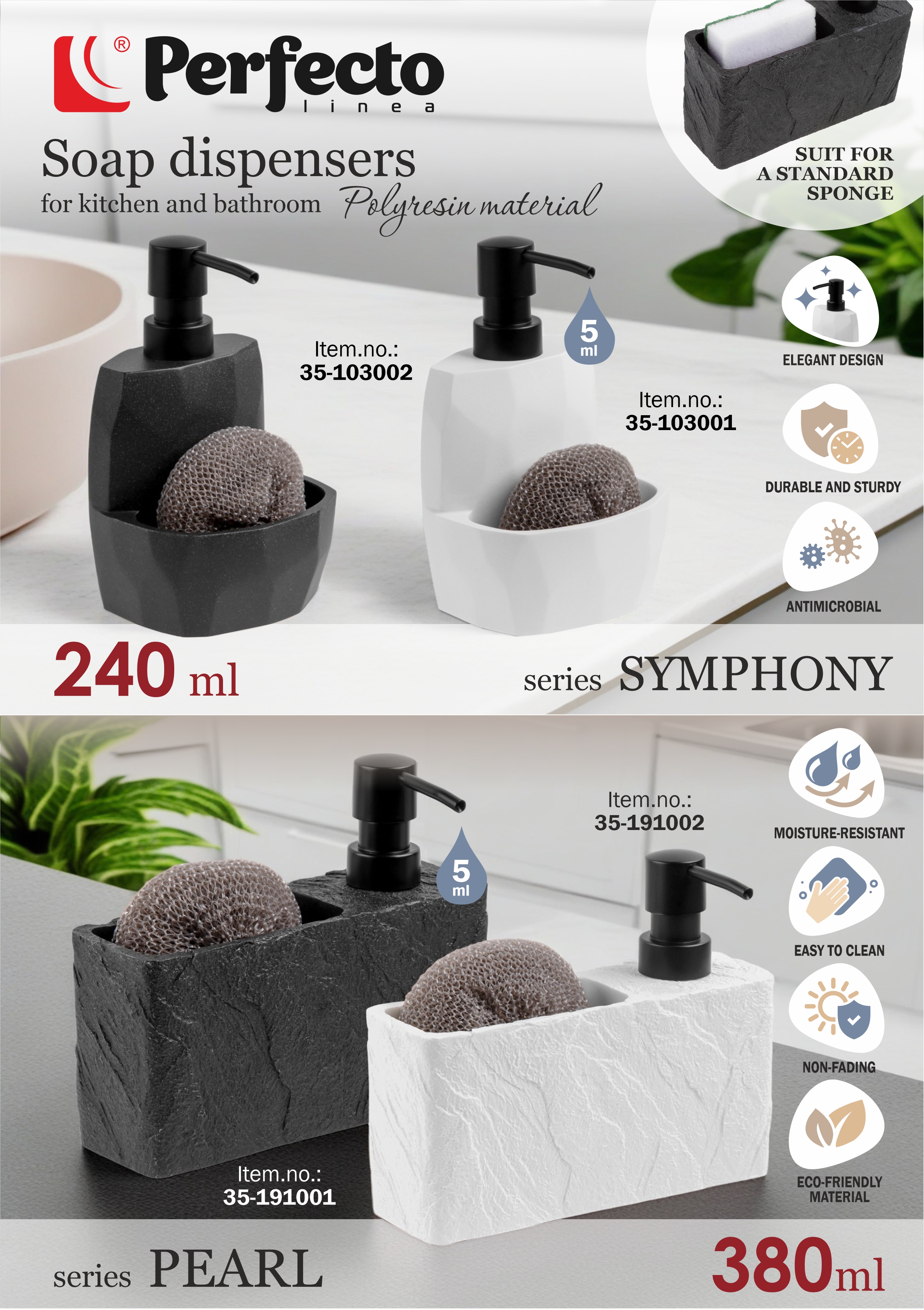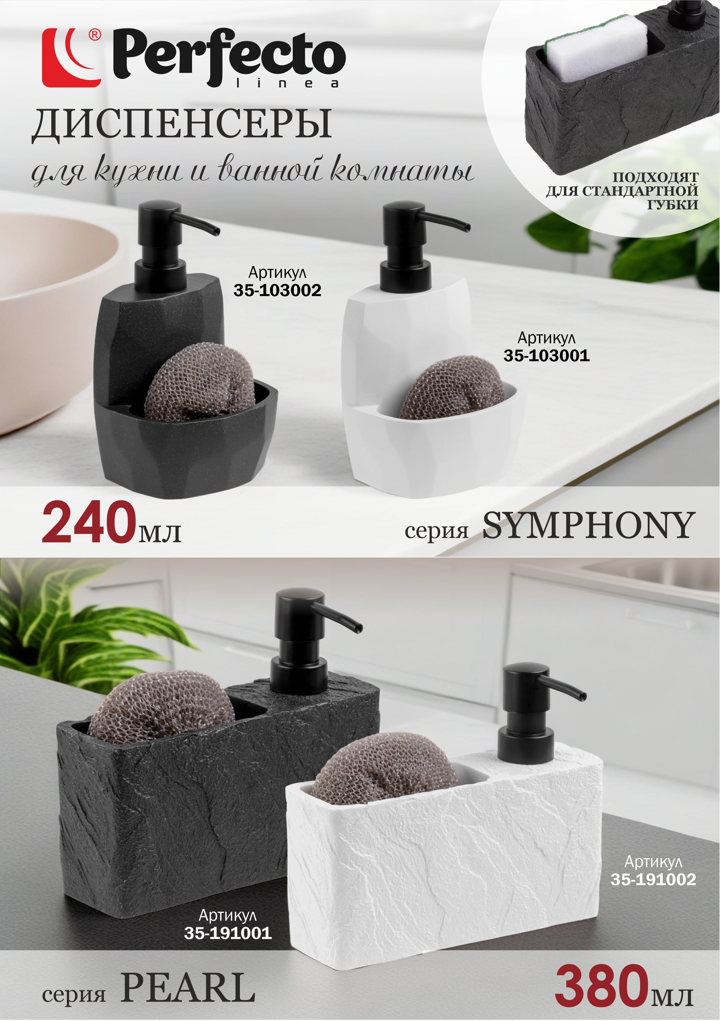 Диспенсер для моющего средства с подставкой для губки PERFECTO LINEA представляют собой великолепное сочетание функциональности и эстетичности, способный украсить не только вашу кухню, но и ванную комнату. Изготовленный из полирезина, имитирующий натуральный камень, он воссоздает непревзойденную красоту и текстуру природы, делая диспенсер не только прочным и стойким к повреждениям, но и универсальным для разных помещений. Вдобавок, каждый диспенсер поставляется в комплекте с губкой, создавая неотразимую комбинацию удобства и стиля. С этим универсальным диспенсером ваш дом наполняется нежностью и функциональностью, добавляя элегантности в повседневные задачи. Наслаждайтесь невероятной практичностью и красотой, принося комфорт и элегантность в любое помещение, в котором они используются. Размер подставки для губки: ширина 6 см, высота 5 см, длина 10,5 см Не рекомендуется использовать средства, содержащие в составе кислоты.