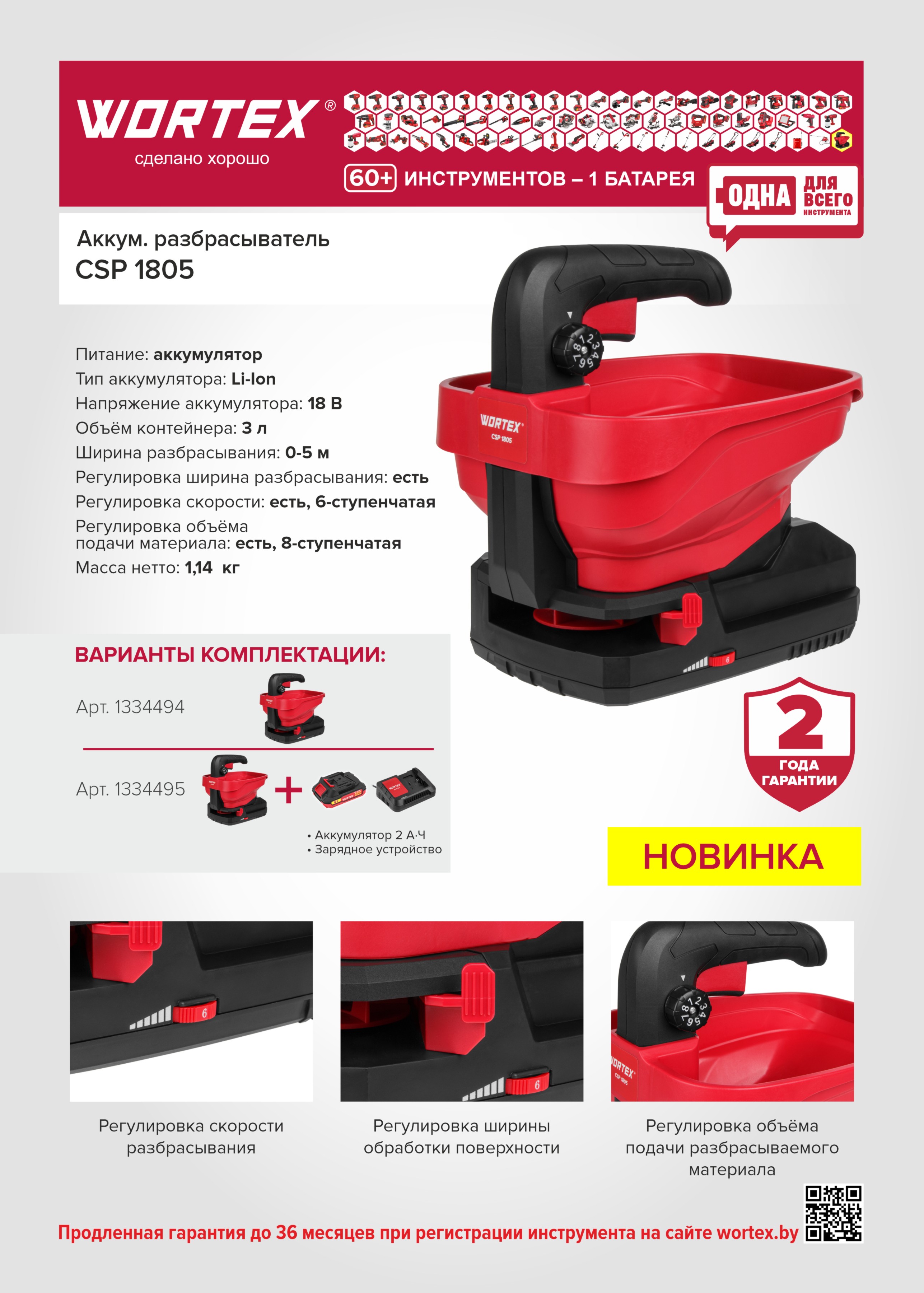 Аккум. разбрасыватель WORTEX CSP 1805 в кор. ALL1 МЕГА АКЦИЯ в кор. 18 В, 1 АКБ 2 А.ч. + з/у шир. 5м