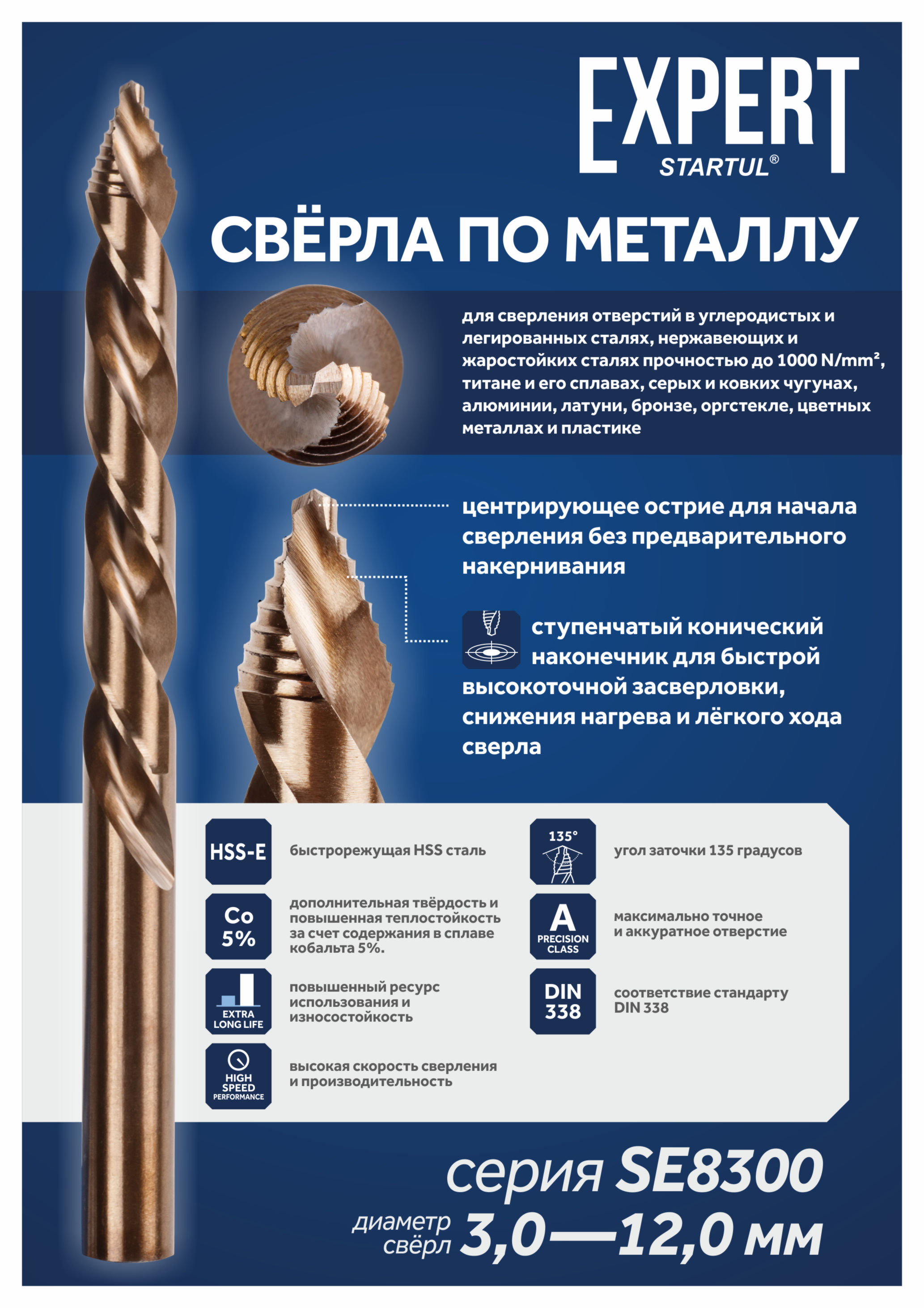 - для сверления отверстий в конструкционных углеродистых и легированных сталях, нержавеющих и жаростойких сталях прочностью до 1000 N/mm2, титана и его сплавов, бронзы, латуни, цветных металлах, чугуне, твердом пластике. Сверло спиральное изготовлено из высококачественной быстрорежущей стали с уже вышлифованным профилем. Выход стружки легче, температура нагрева и биение сверла в патроне меньше, стойкость режущей части выше. Отверстия имеют высокую точность. Подточка поперечных режущих кромок позволяет начинать сверление без предварительного засверливания центрирующим сверлом или кернения. Повышенный ресурс использования. Обладают повышенной производительностью, износостойкостью и красностойкостью. Максимально точное и аккуратное сверление. Дополнительная твердость и повышенная теплостойкость за счет содержания в сплаве кобальта. Подходят для профессионального использования
