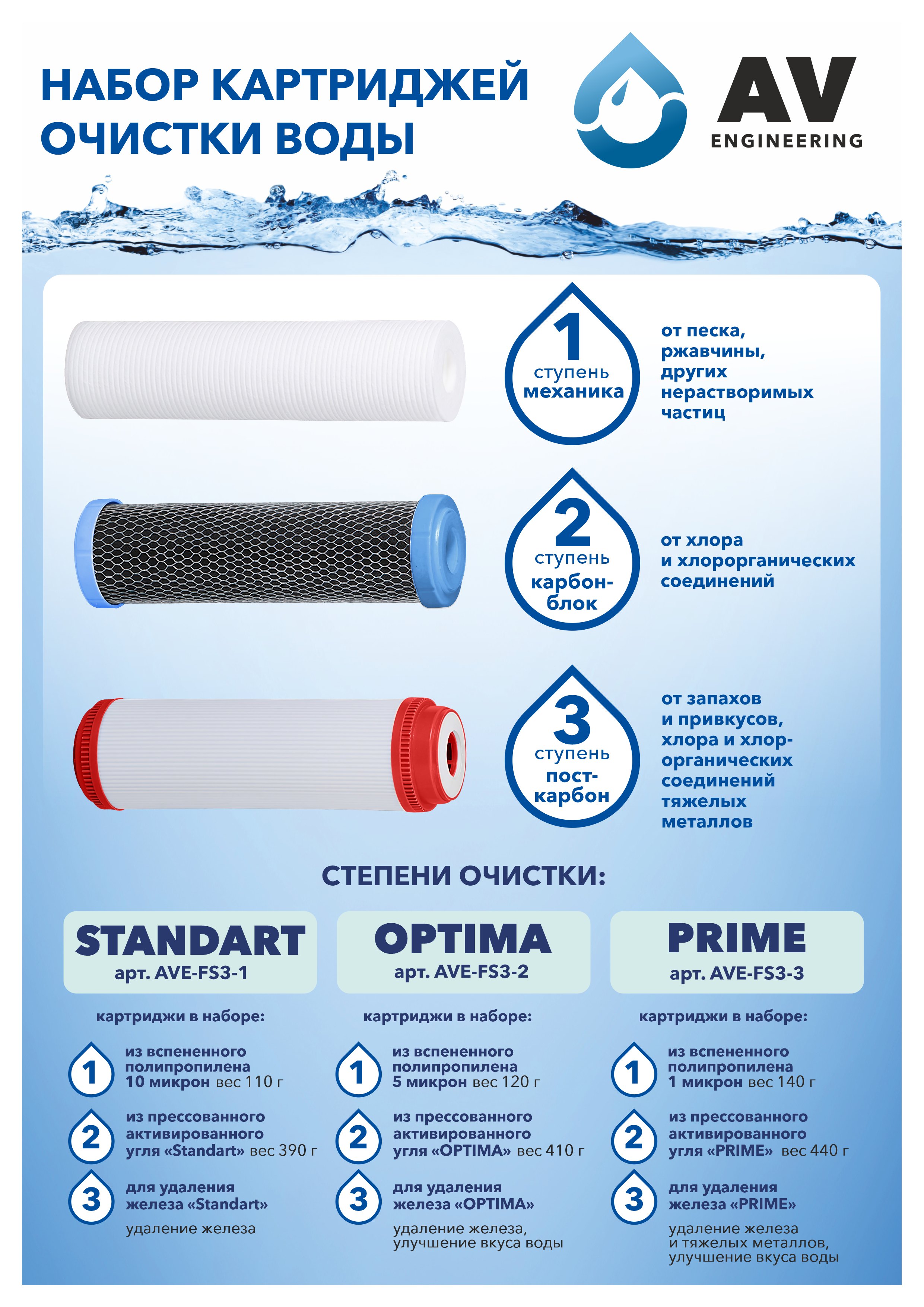 Набор картриджей, 3 шт, AV Engineering "Optima" (PP, Уголь, Удаление железа)