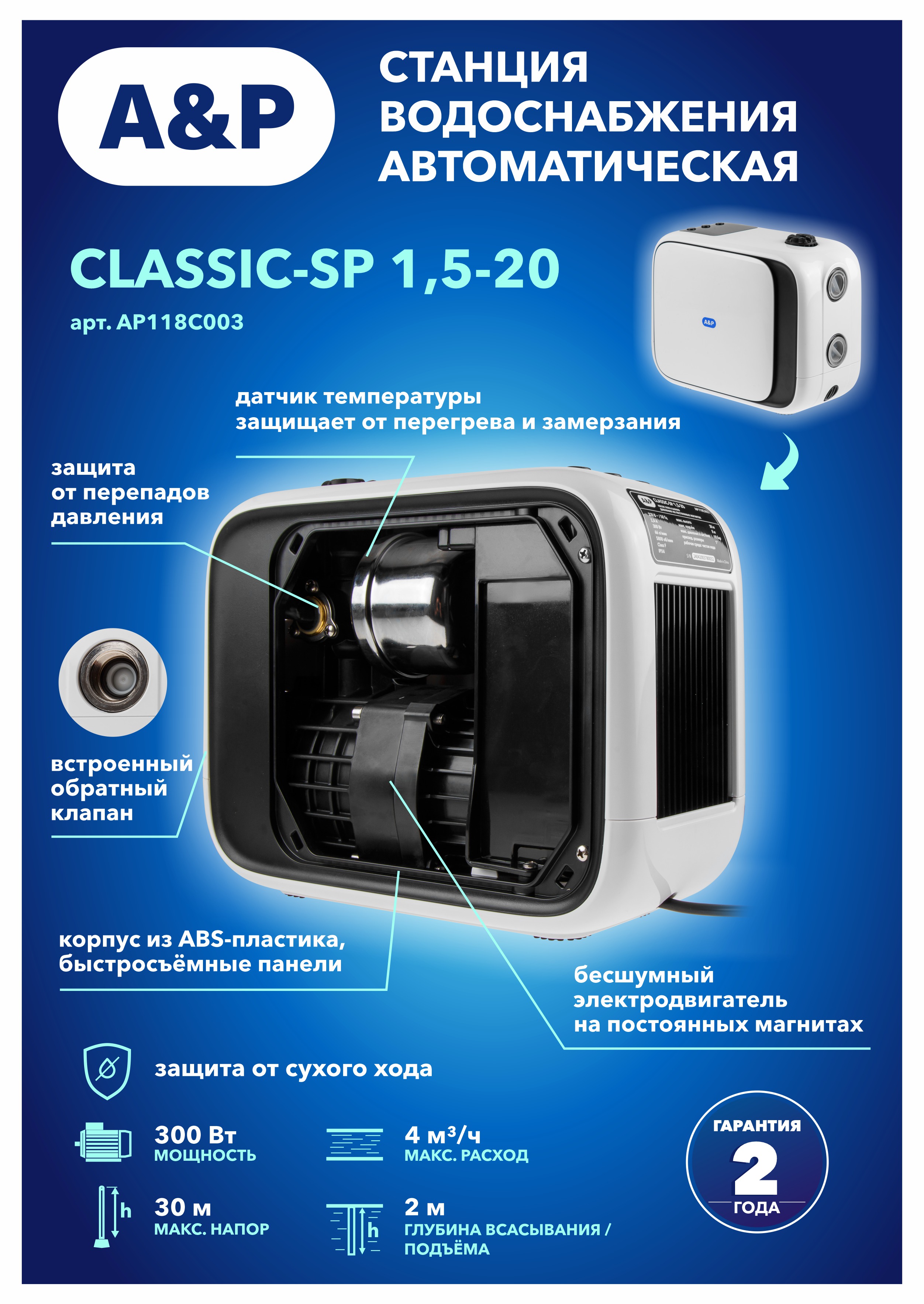 Станция водоснабжения автоматическая CLASSIC-SP 1,5-20, A&P (300 Вт, 4000 л/ч, 30 м, для повышения давления/водоснабжения)