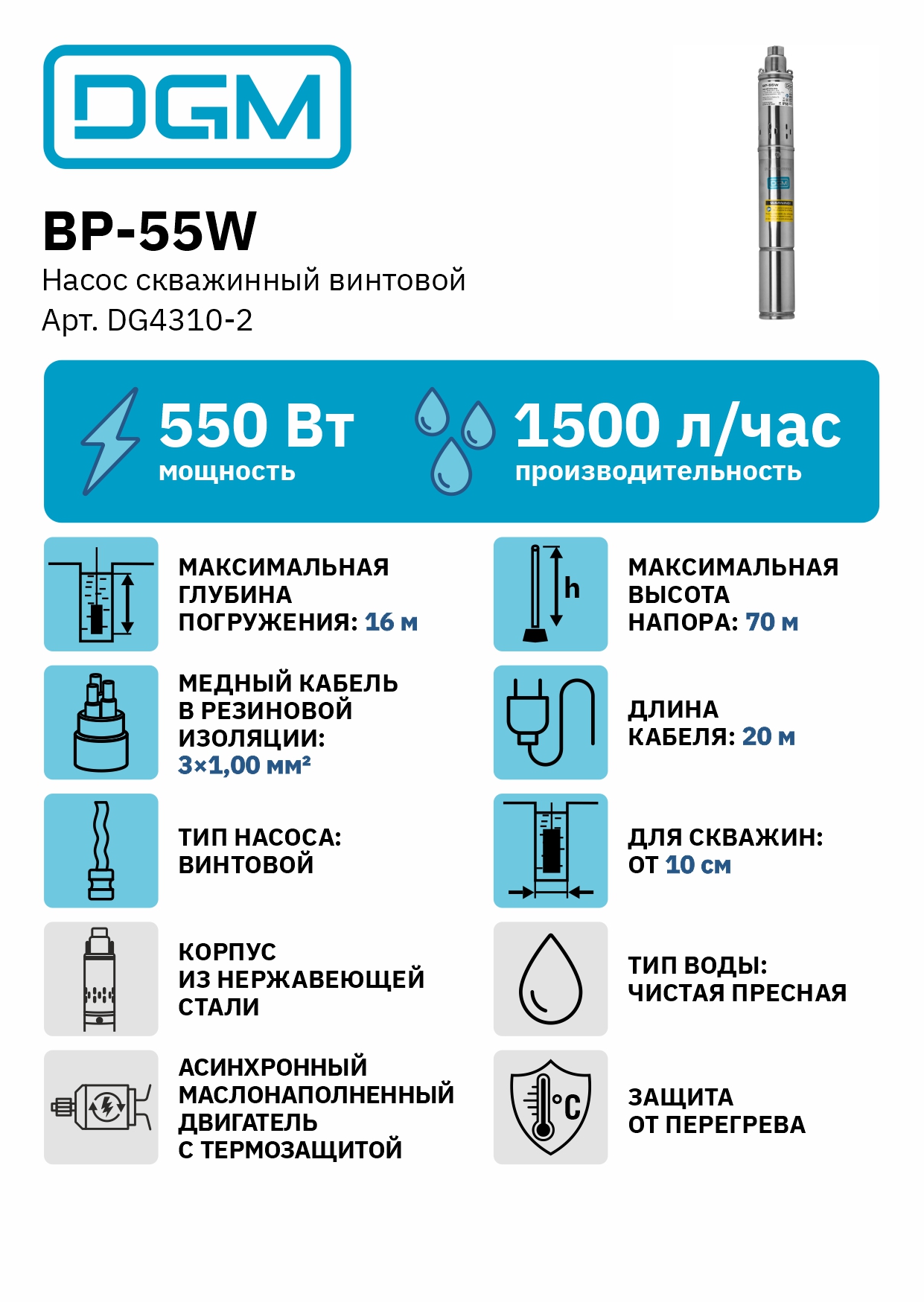 Насос скважинный винтовой DGM BP-55W (550 Вт, 25 л/мин (1,5 м3/ч), 70 м выс. напора, винтовой, диам. корп. 3"/ 7,62 см)