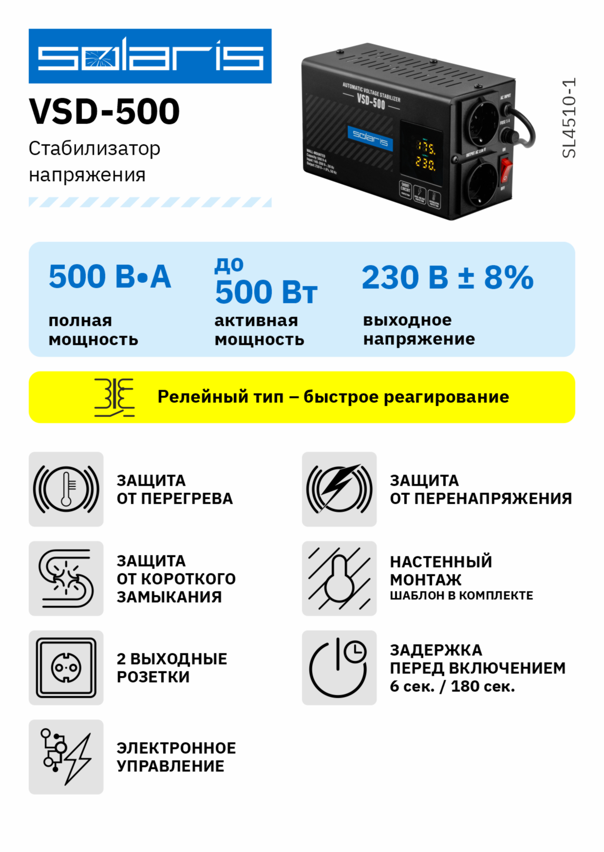 Стабилизатор напряжения Solaris VSD-500 (500 В*А; 140-260 В; 2 розетки; настенный монтаж)