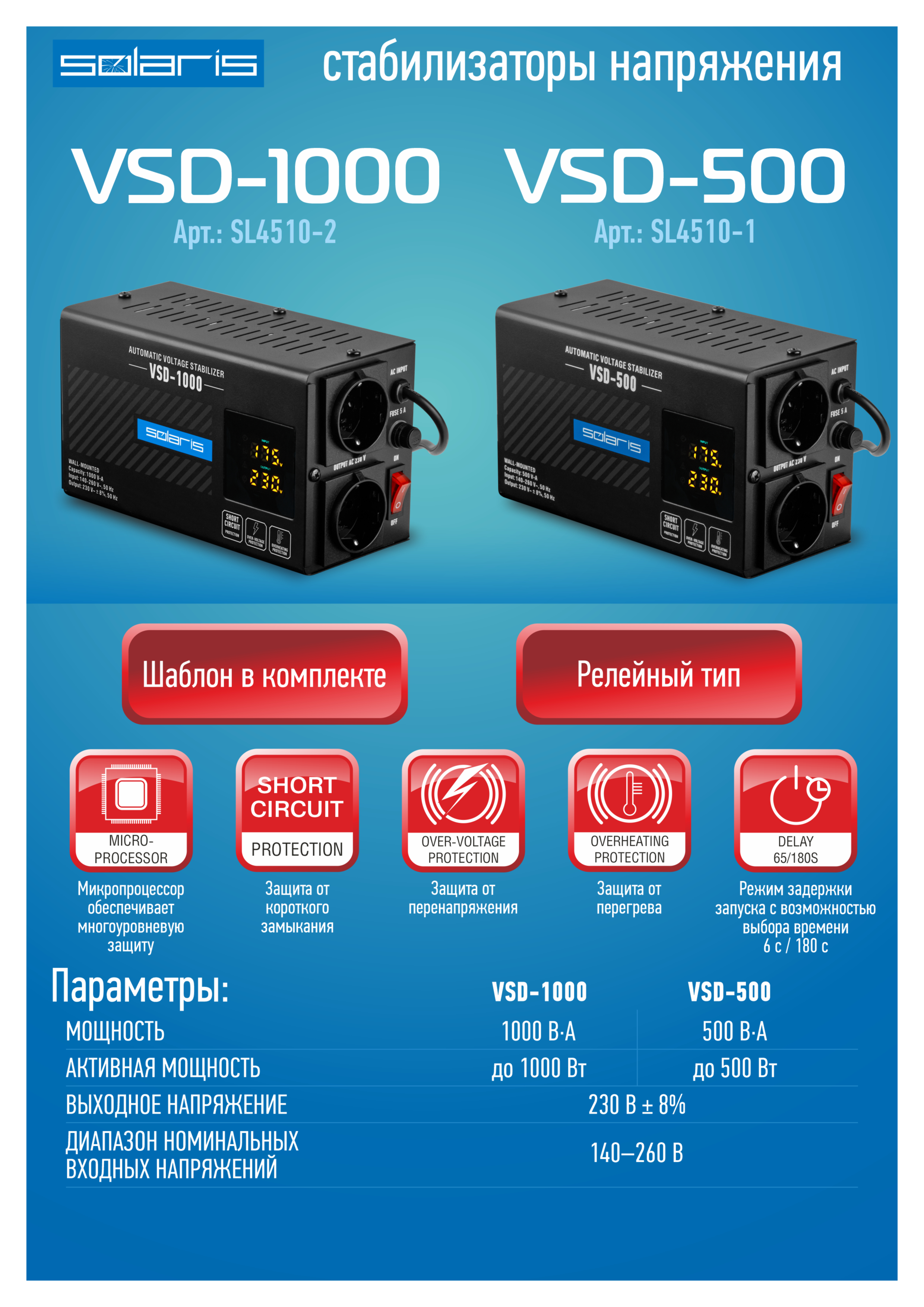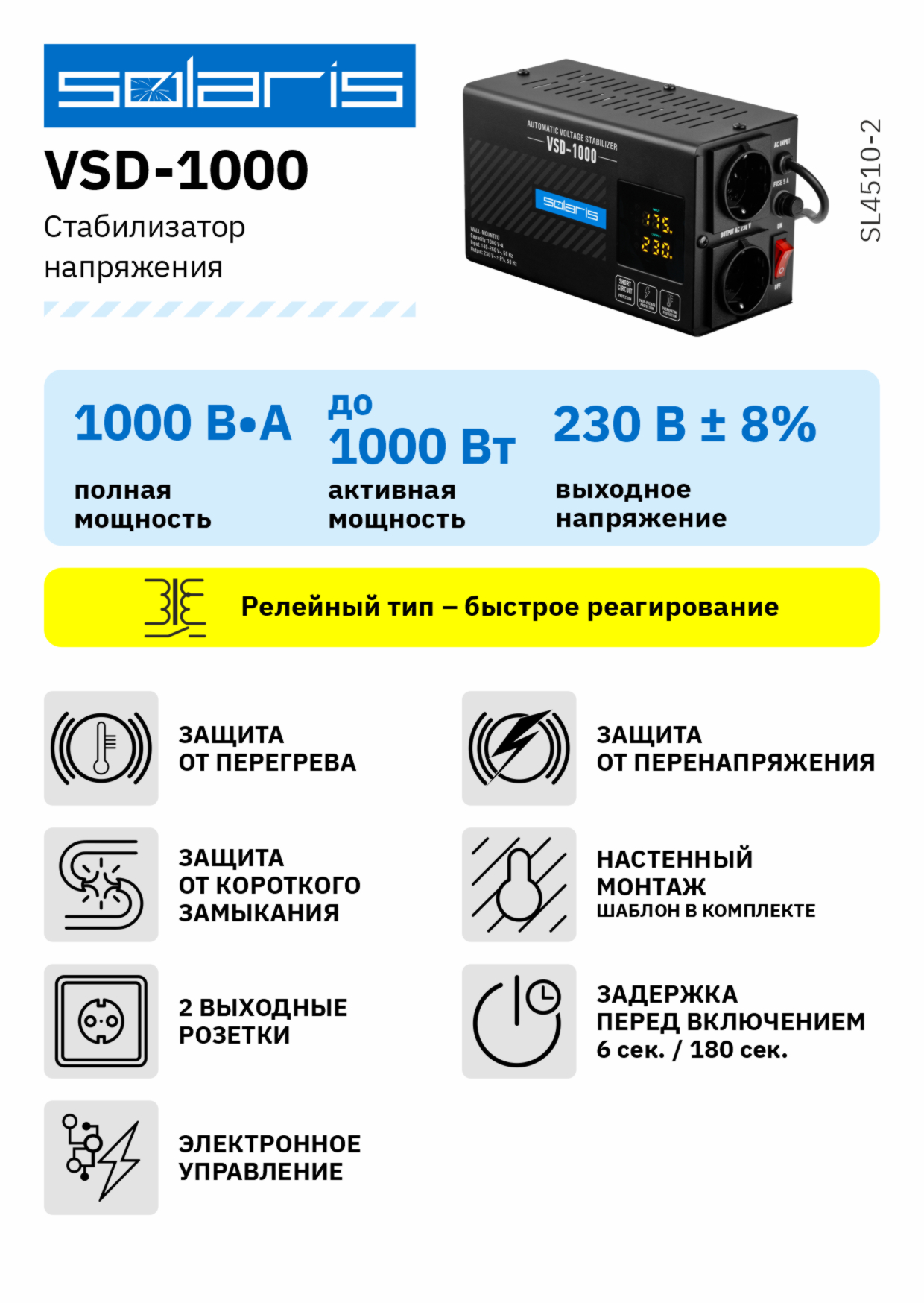Стабилизатор напряжения Solaris VSD-1000 (1000 В*А; 140-260 В; 2 розетки; настенный монтаж)