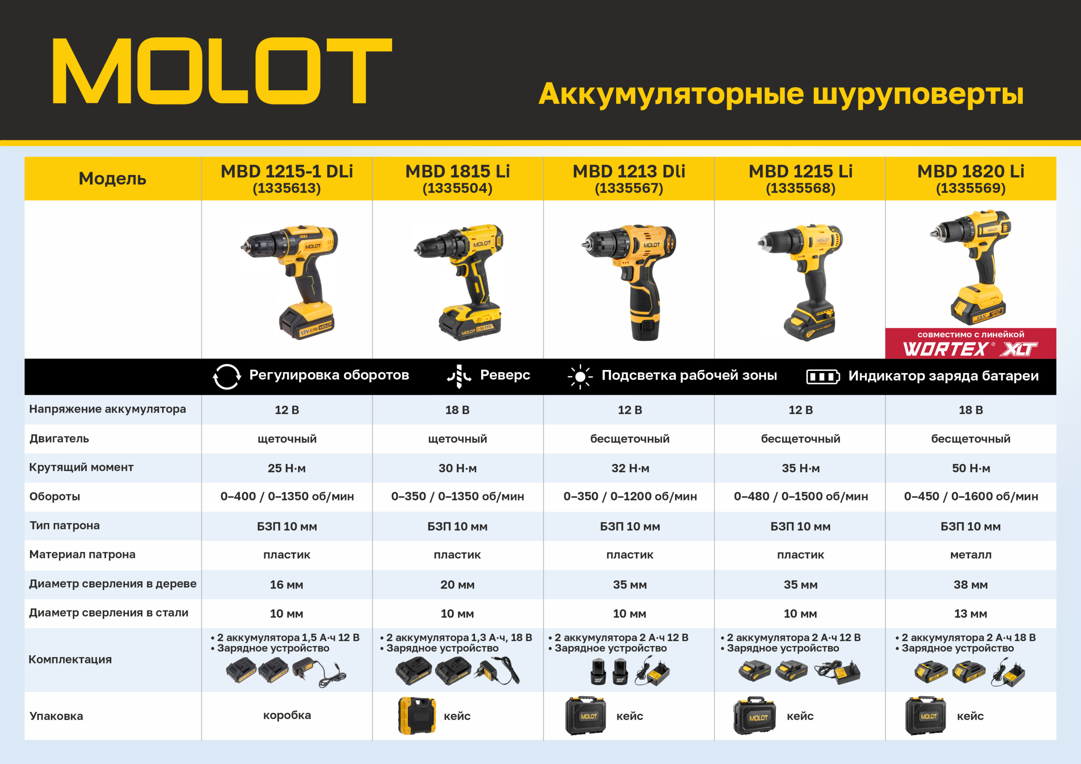 Аккум. дрель-шуруповерт MOLOT MBD 1215 Li в чем. (БЕСЩЁТ., 12 В, 2 акк., 2 А/ч Li-Ion, 2 скор., 35 Нм)