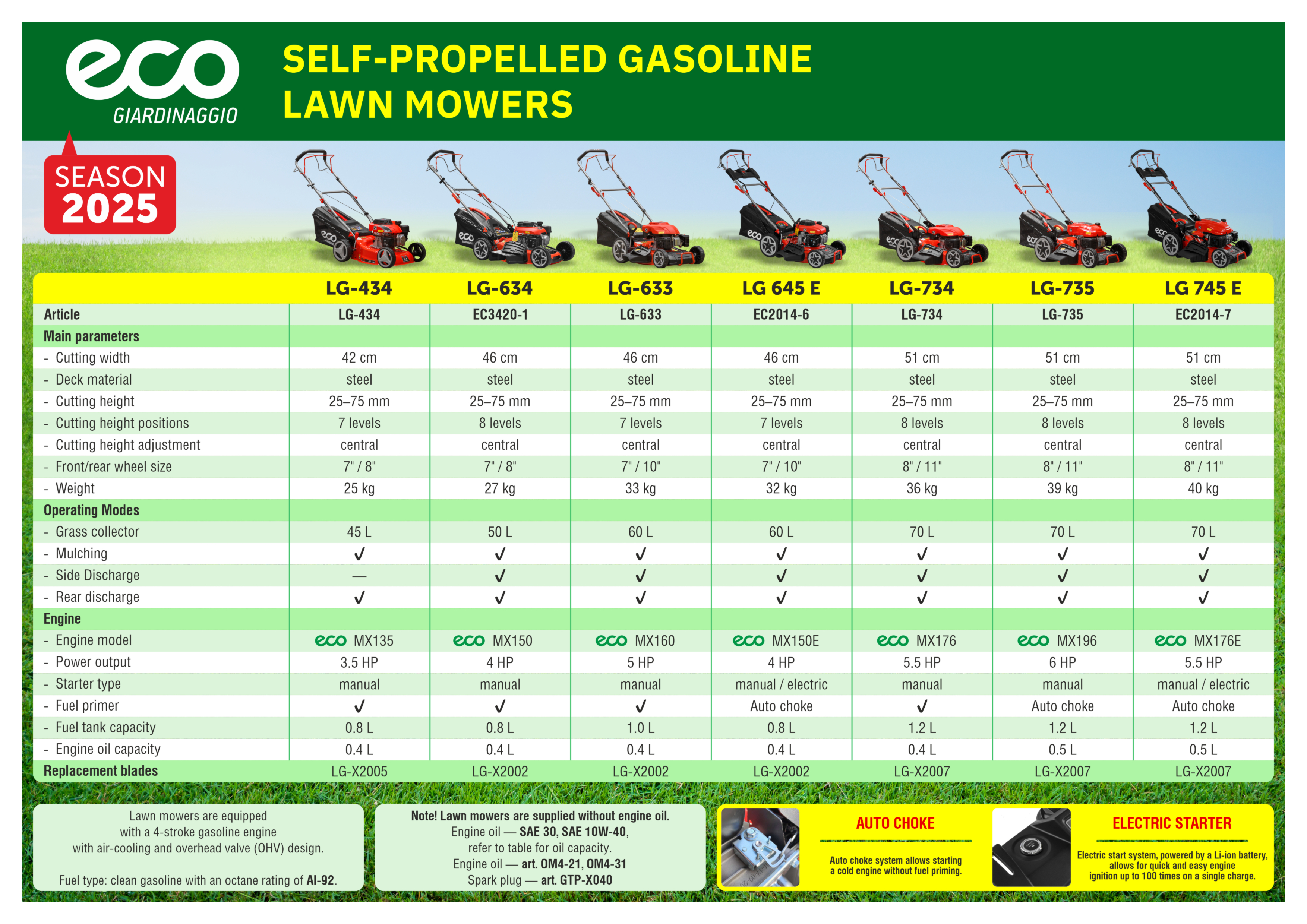 Газонокосилка бензиновая ECO LG-645 E самоходная (4 л.с., шир. 46 см, самоходная, электростарт, мульчир., стальн. корпус, травосборник 60 л)