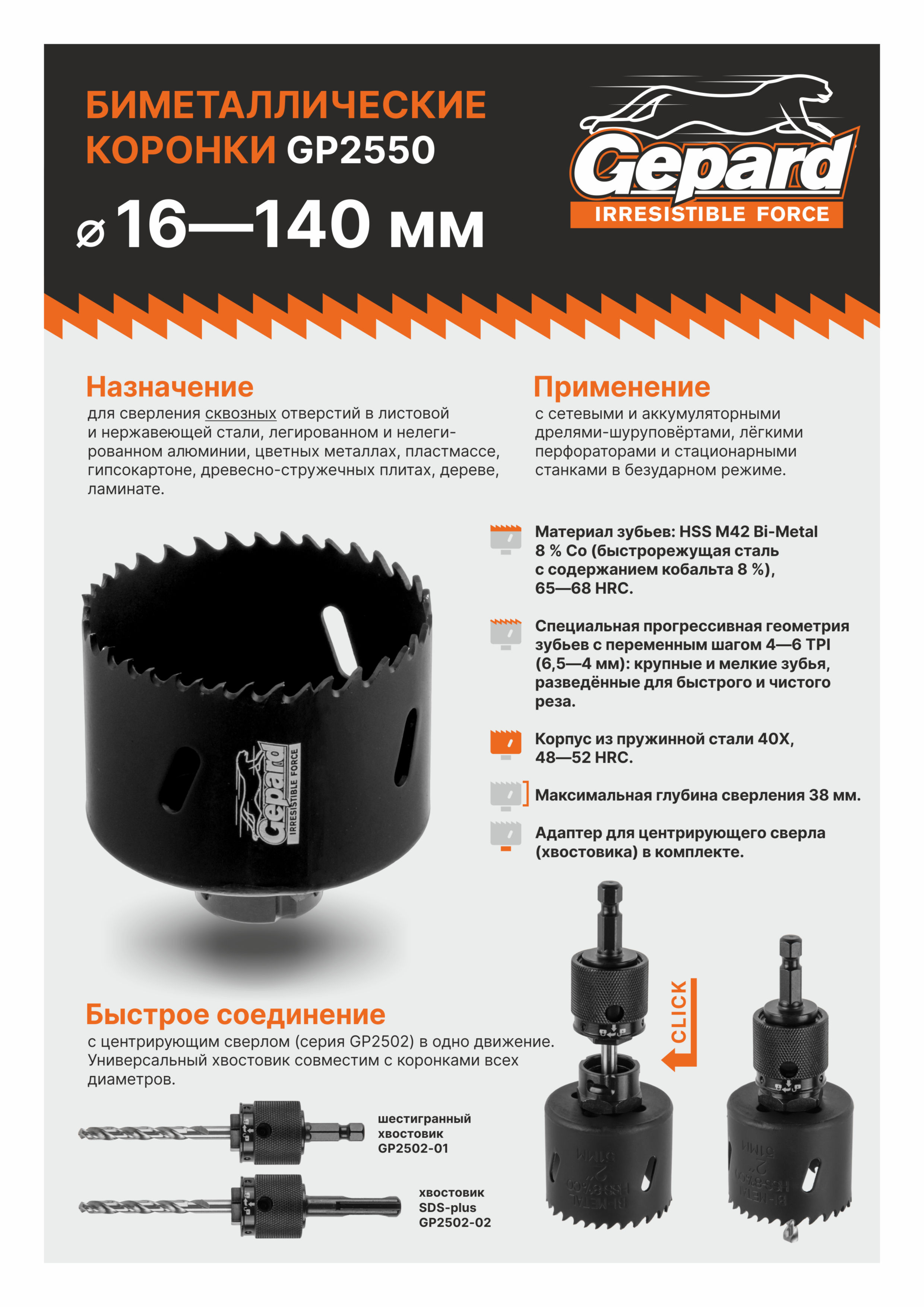 Применение: для сетевых и аккумуляторных дрелей-шуруповертов, легких перфораторах и со стационарными станками в безударном режиме; Назначение: для сверления сквозных отверстий в листовой и нержавеющей стали, легированному и нелегированному алюминию, цветным металлам, пластмассе, гипсокартону, древесно-стружечным плитам, дереву, ламинату; Зубья: специальная прогрессивная геометрия зубьев с переменным шагом 4-6 TPI (4-6,5 мм), крупный и мелкий зуб, разведённые для быстрого и чистого реза.